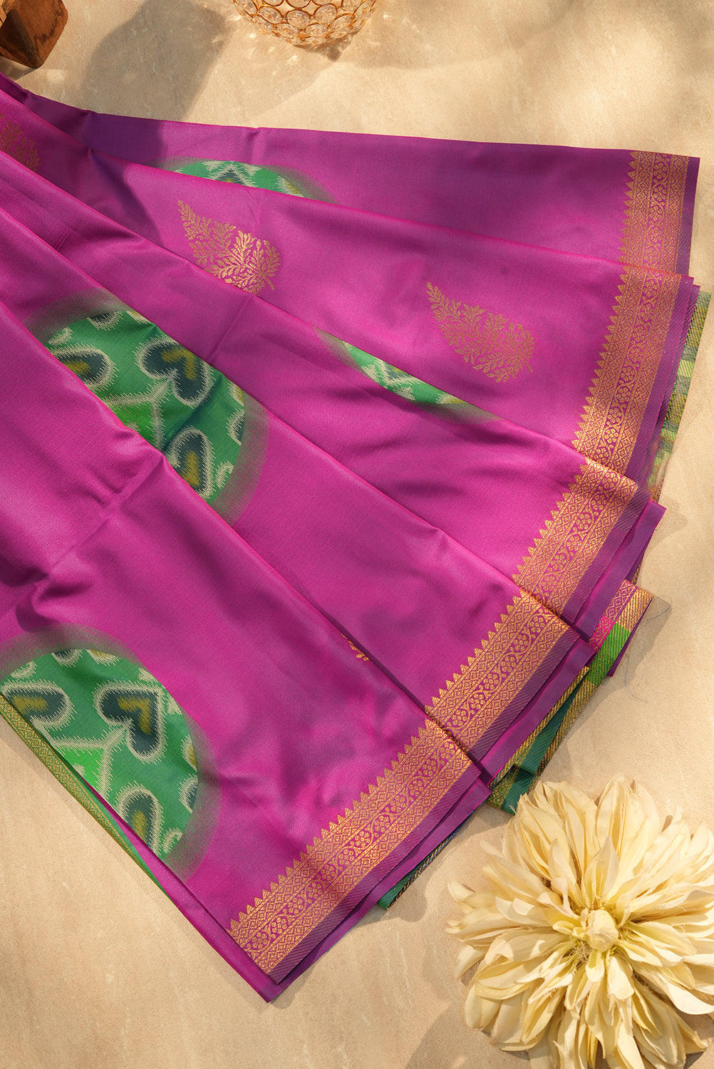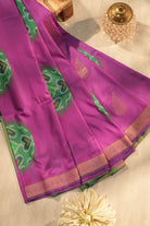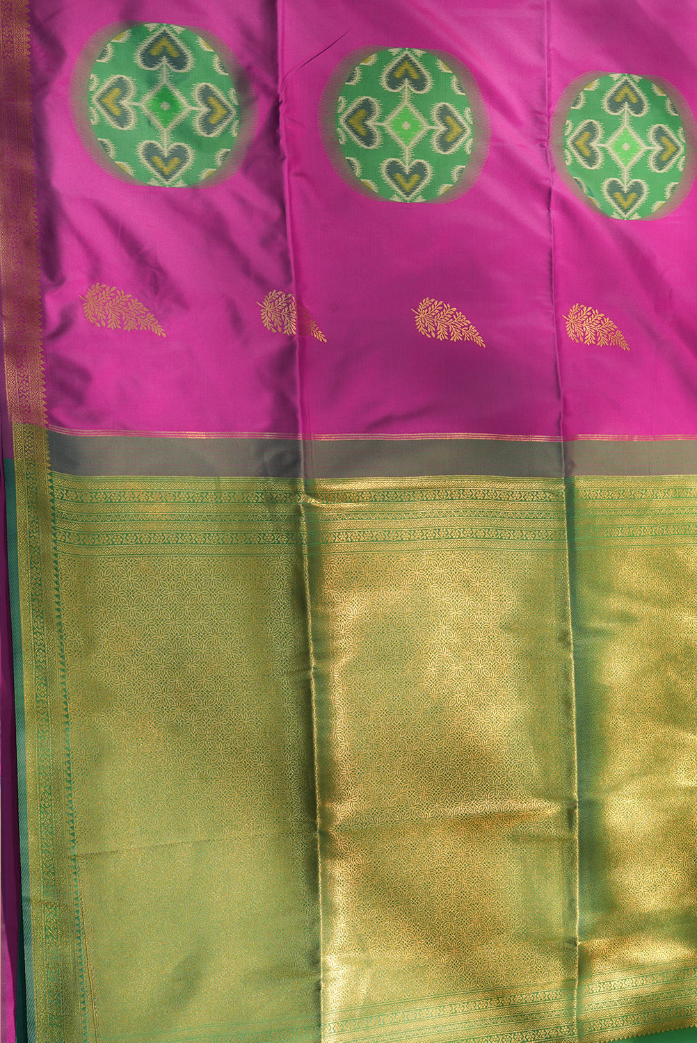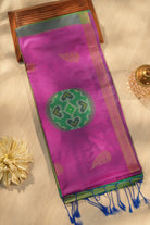 Radiant in Rani Pink, this soft silk saree features delicate gold zari leaf buttas across the body. The highlight is the stunning contrast Emerald Green pallu, adorned with traditional Ikkat Patola patterns and heart motifs. Finished with a classic gold zari border and playful blue tassels. Unstitched blouse attached.