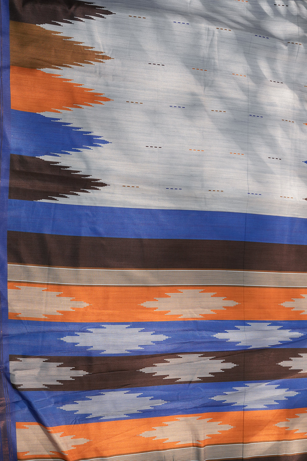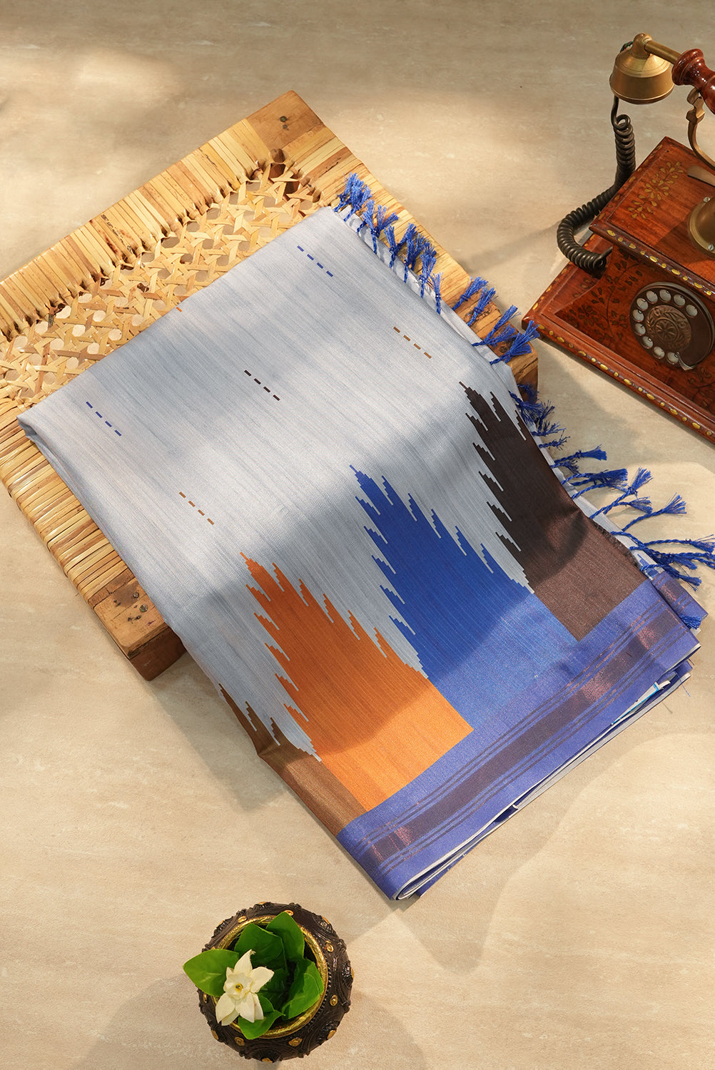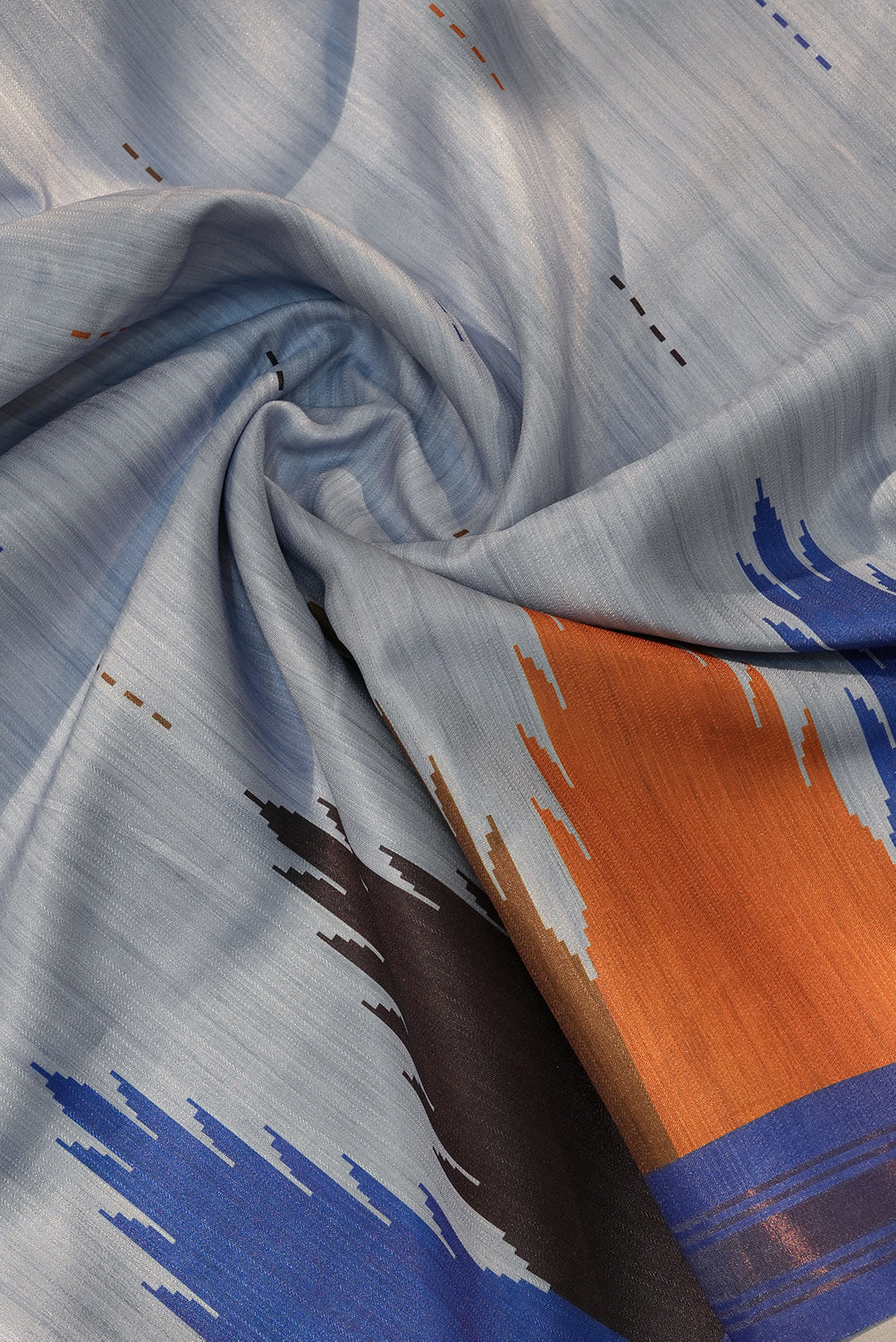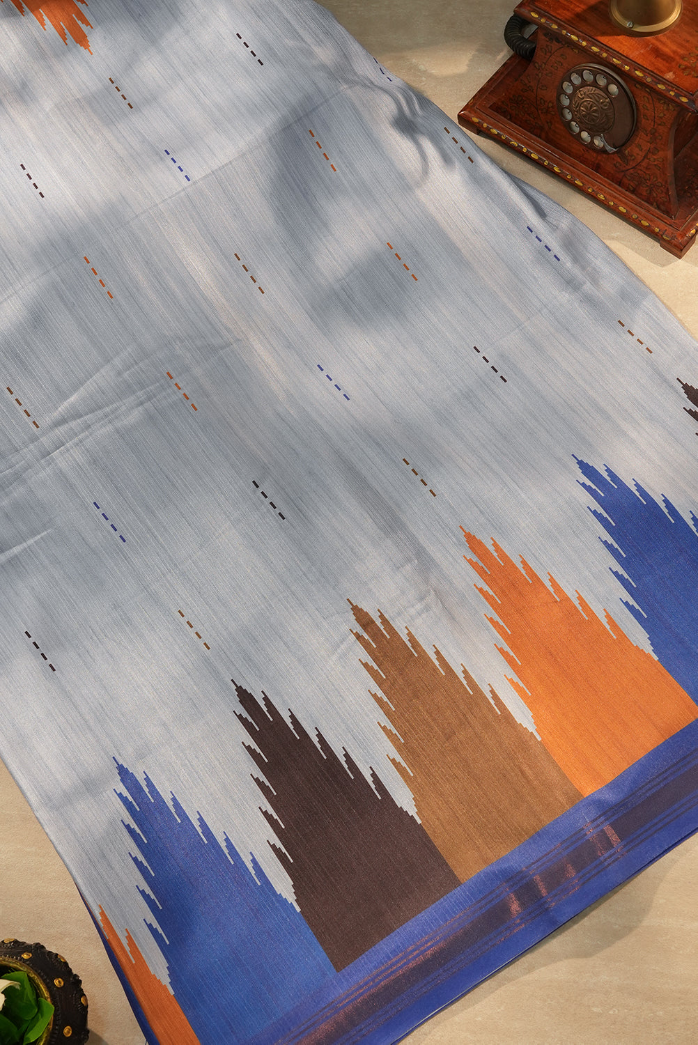 A sophisticated Sky Grey raw silk saree featuring a unique "temple-style" geometric pattern along the border. The design is brought to life with bold accents of Royal Blue, Burnt Orange, and Charcoal Black. Unstitched blouse attached.