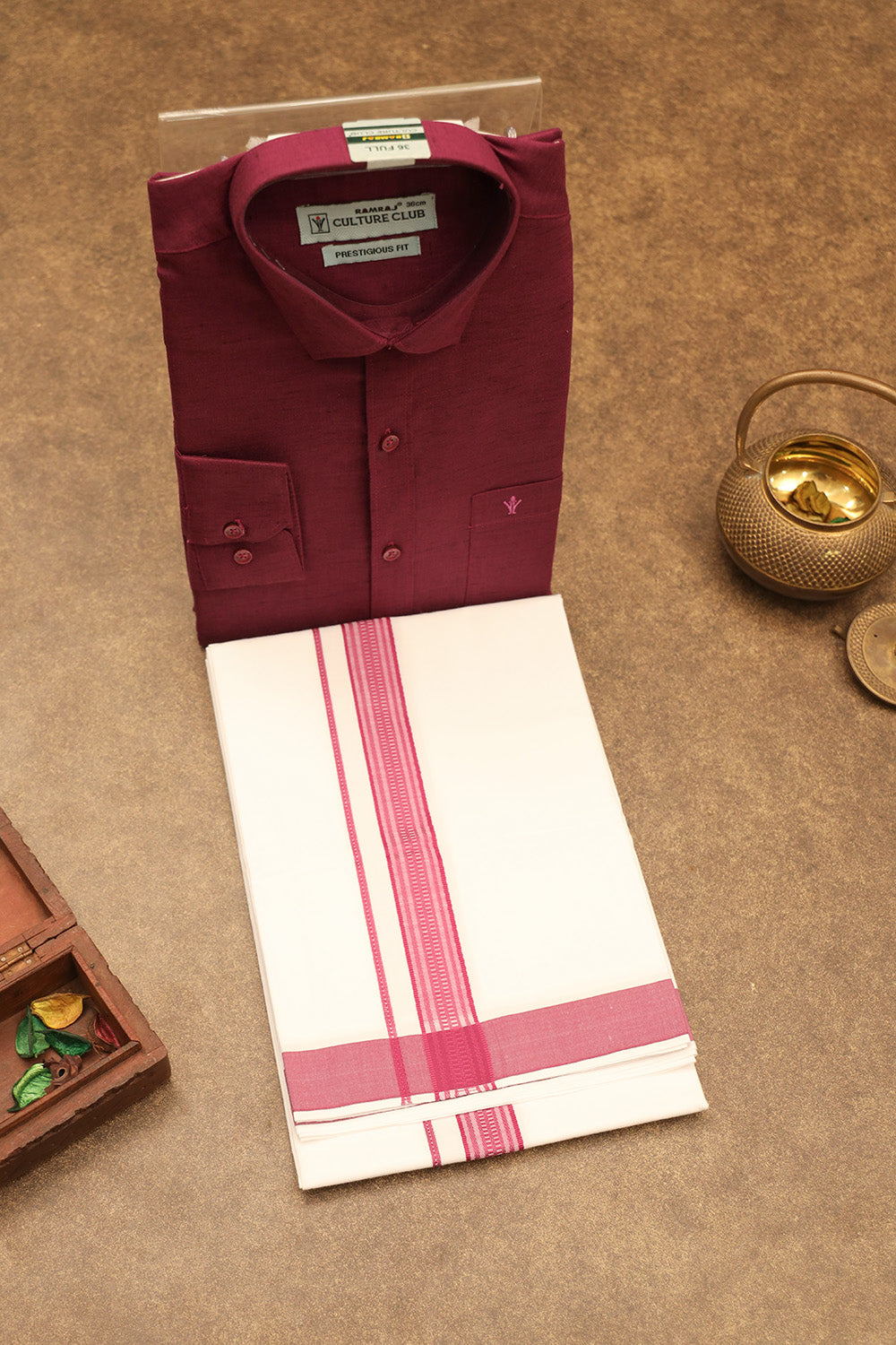 This elegant ensemble features Purple full-sleeved shirt paired with a crisp white dhoti. The dhoti boasts a subtle pink border, adding a touch of refinement. The set is perfect for formal occasions or festive celebrations. 4  yards.