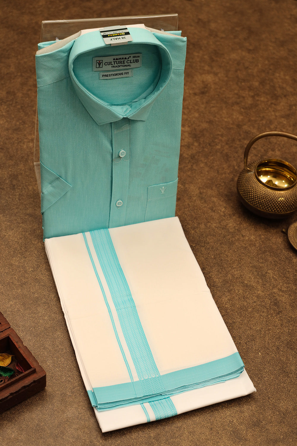 Stay cool and stylish this summer with this mint green half sleeve shirt and white dhoti set. The shirt features a classic collar and half sleeves for a breezy look. The dhoti boasts a vibrant turquoise border with contrasting white lines, adding a touch of traditional flair. This set is perfect for casual outings, festive occasions, or simply relaxing at home. 4 YARDS