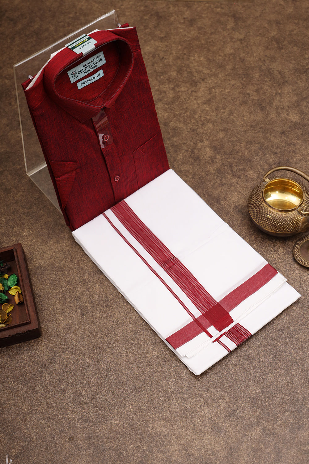Half sleeve maroon shirt complemented by a pristine white dhoti featuring a bold red border for a festive look. 4 YARDS