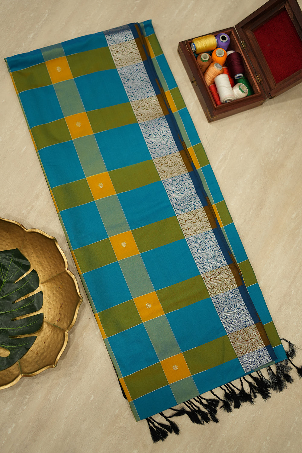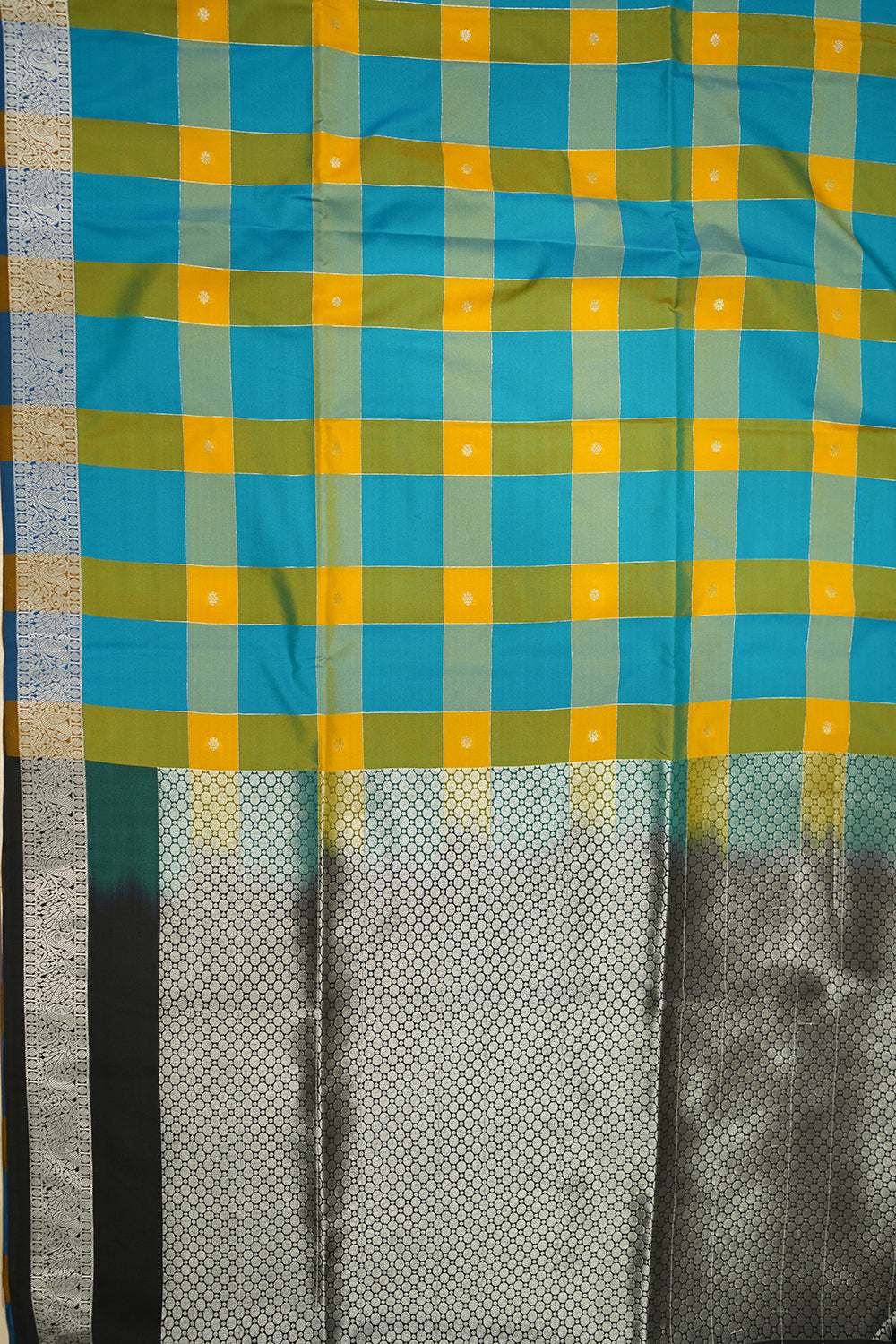 Features a multi-color checks in shades of blue, yellow, and green. contrasted by a rich black pallu. Unstitched blouse attached.