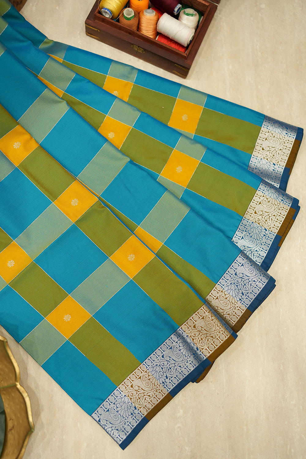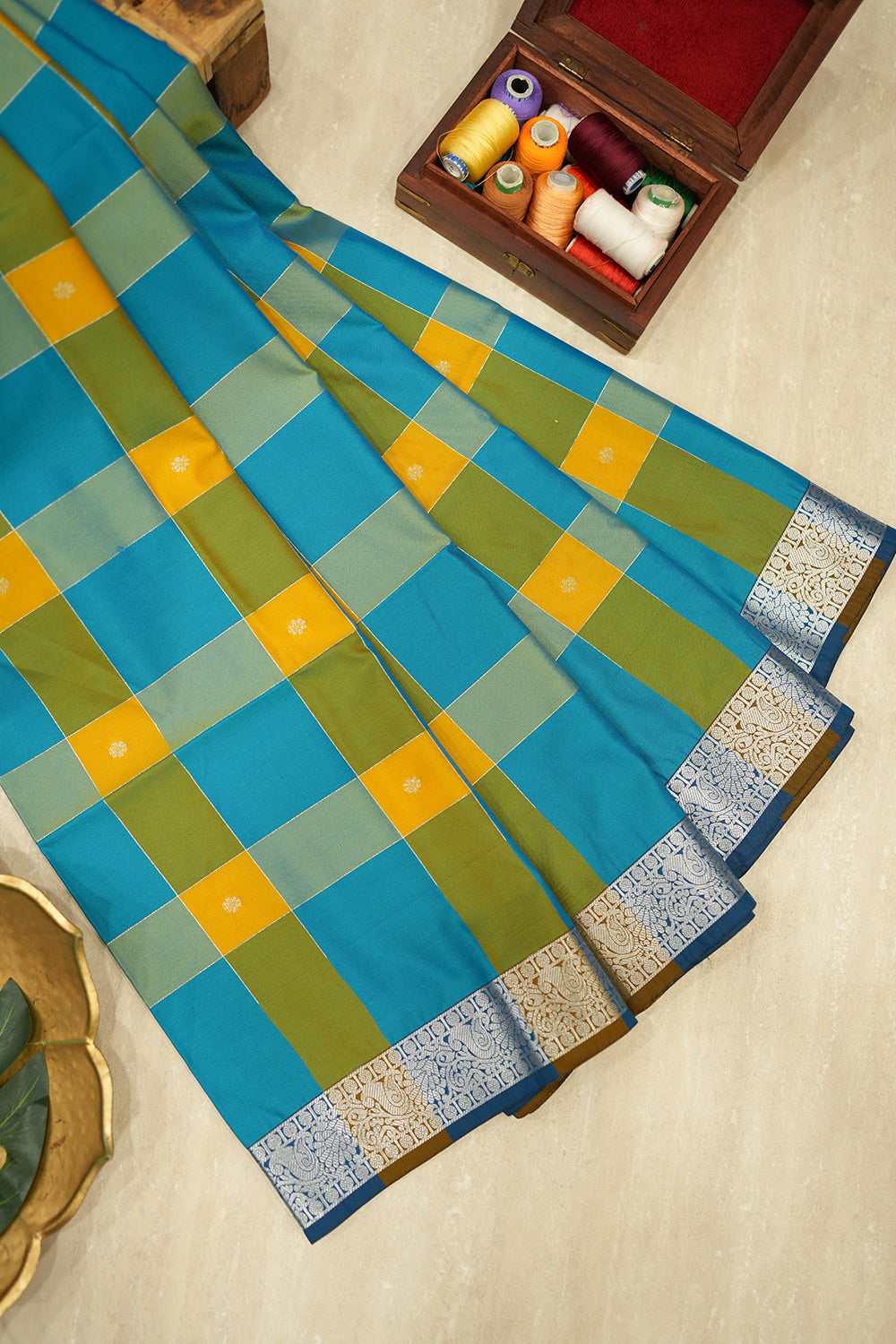 Blue and Yellow checked Soft Silk Saree