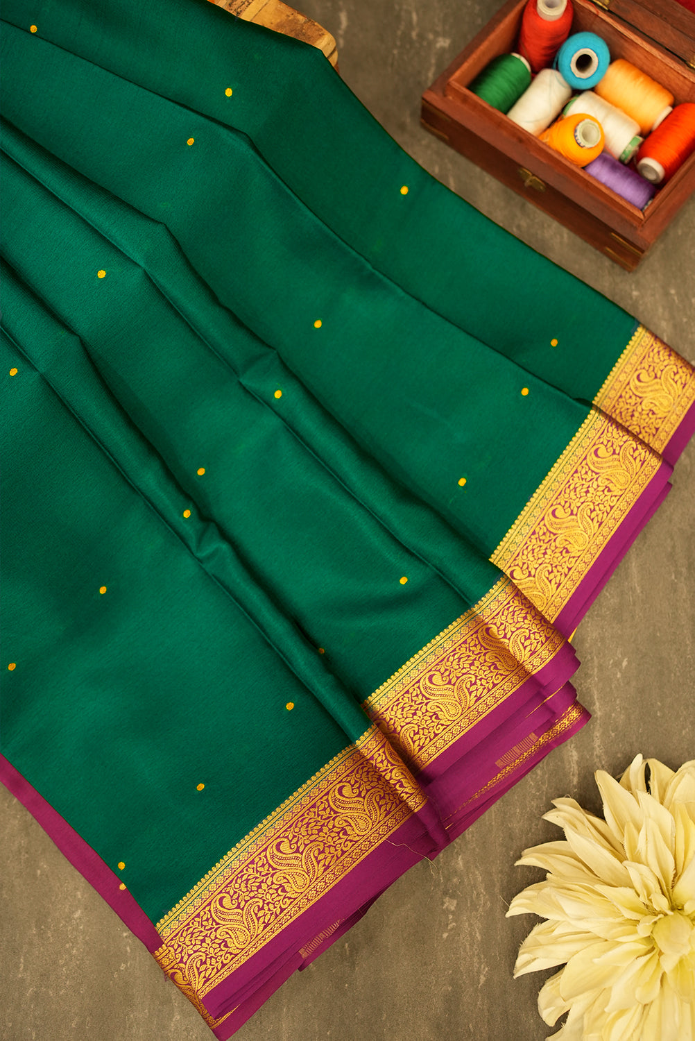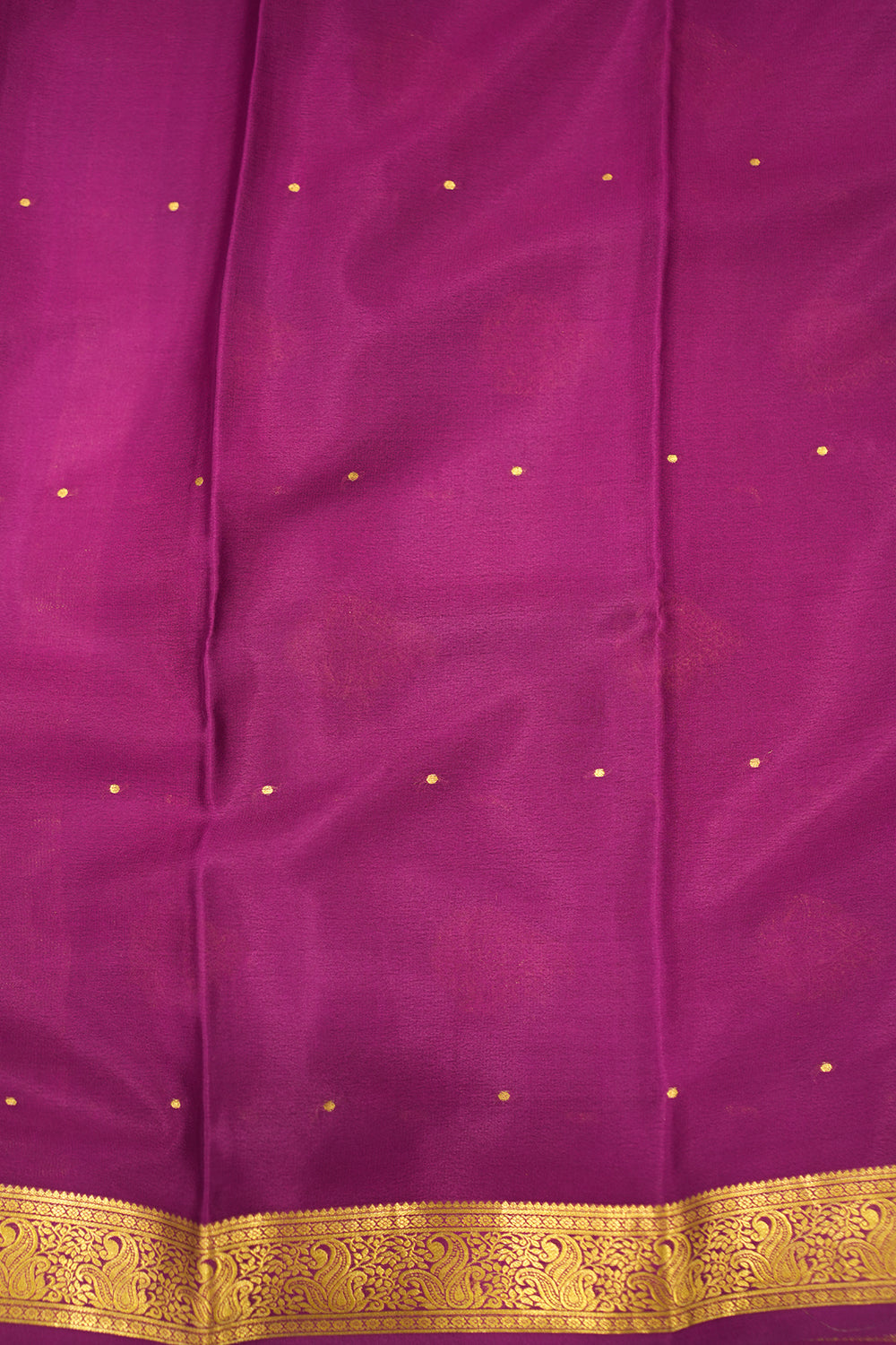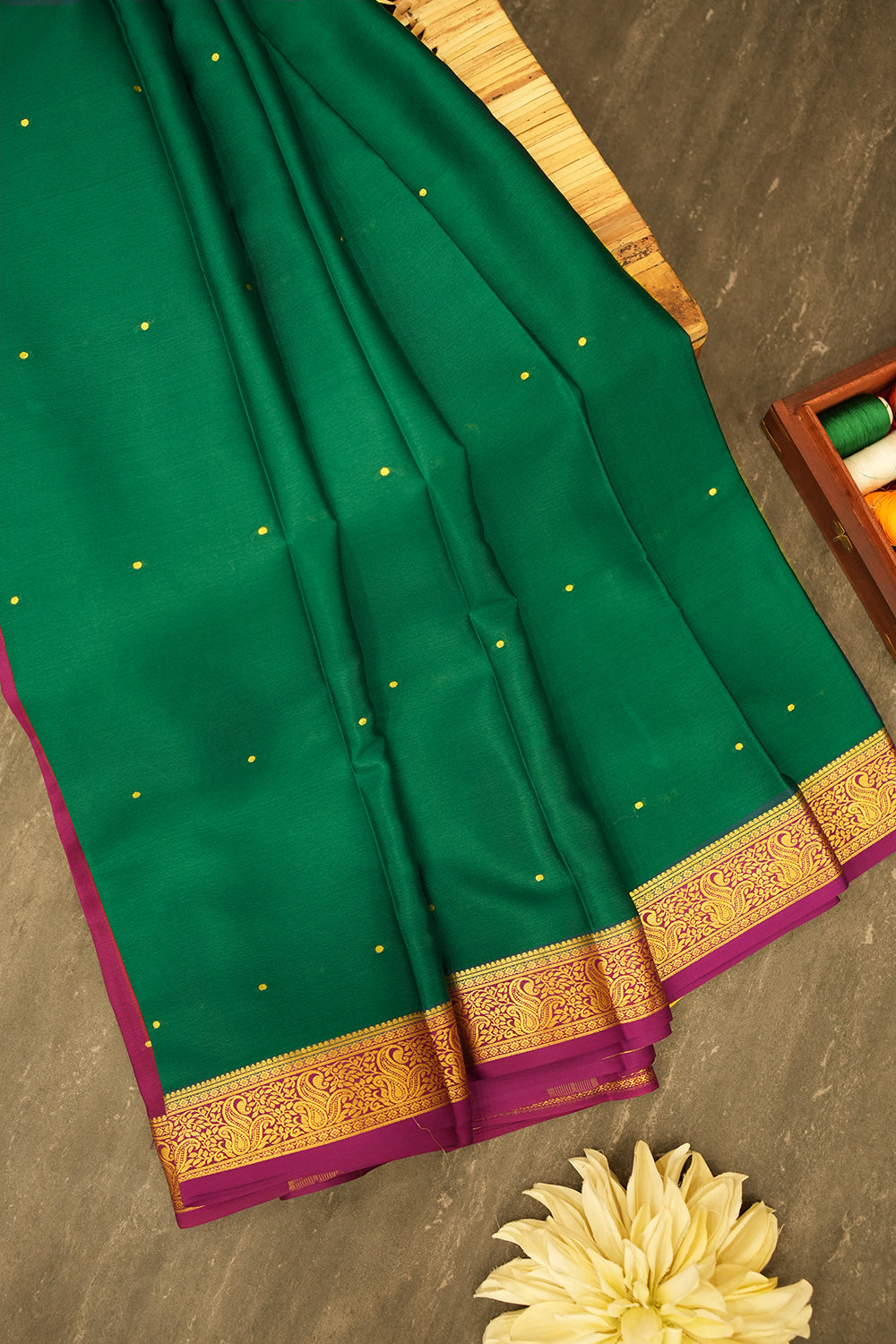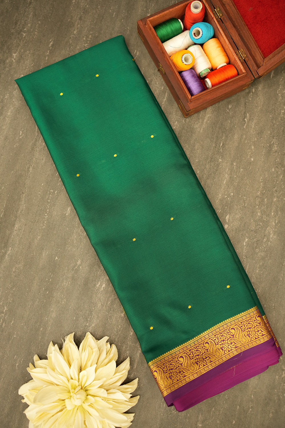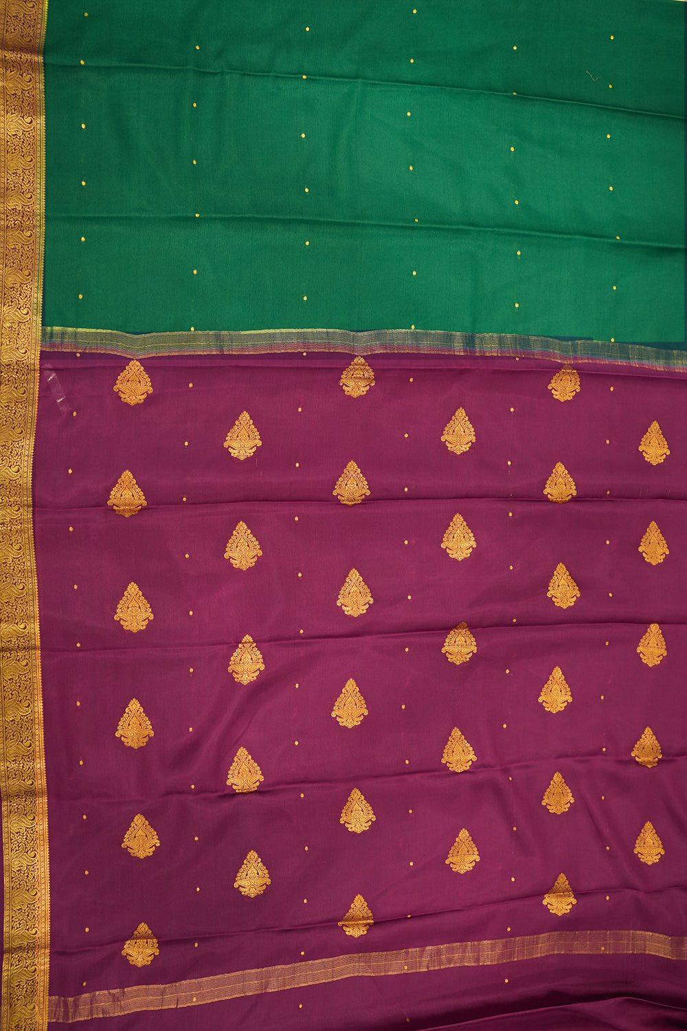 This exquisite Mysore silk saree in a rich bottle green features delicate gold polka dots. It is beautifully complemented by a vibrant purple and intricate gold zari border. Unstitched blouse attached.