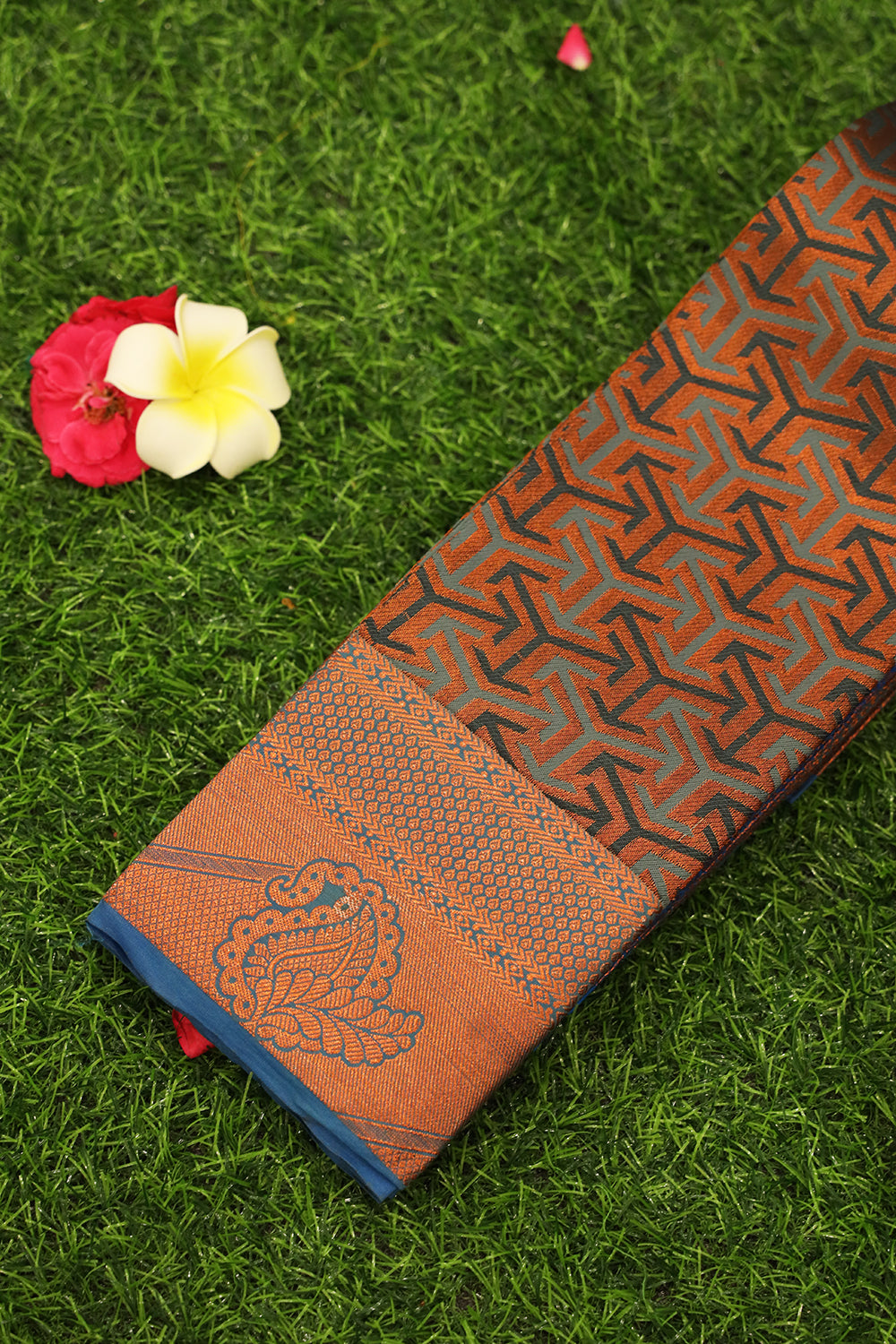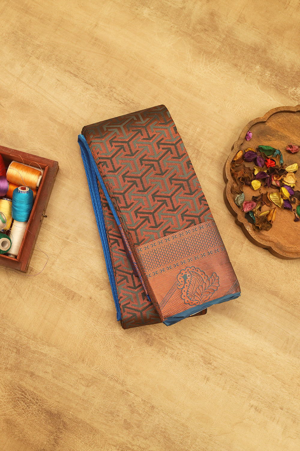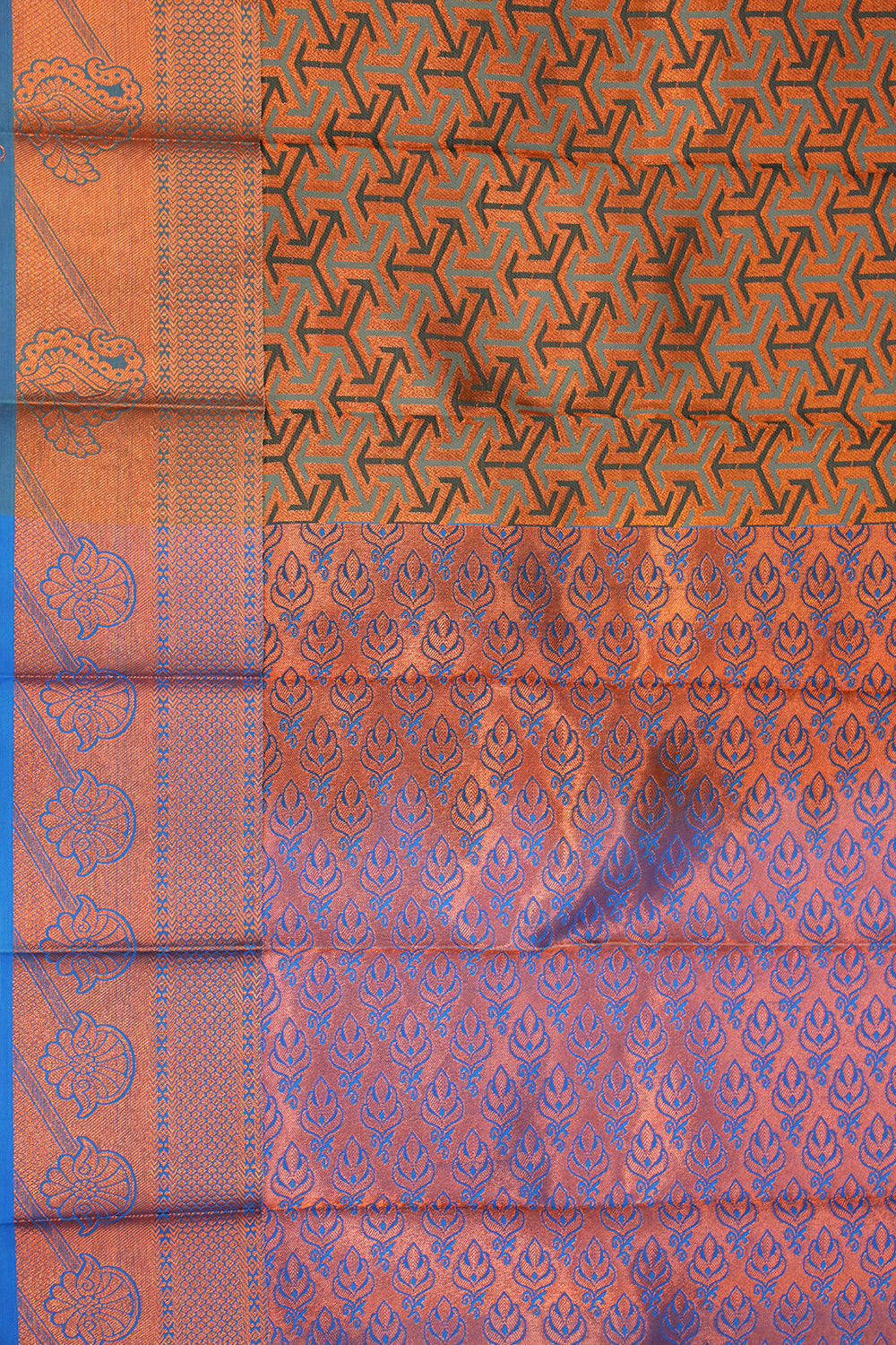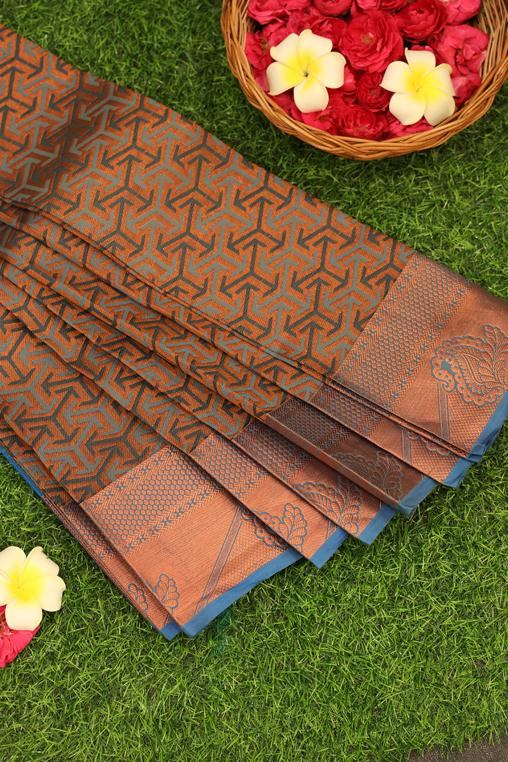 The saree has a rich and elegant vibe, with a striking contrast between the deep brown and blue colors. The geometric pattern adds a modern touch, while the traditional zari work on the border adds a touch of classic elegance.