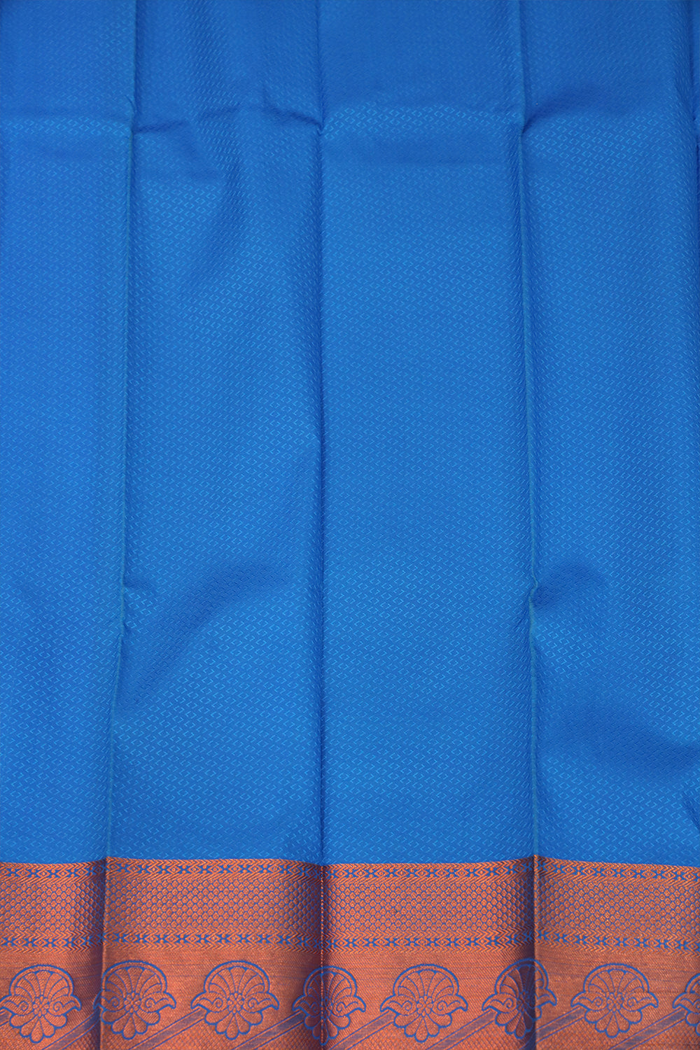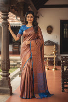 The saree features a deep brown color with a blue border and accents. This color combination is rich and sophisticated, making it suitable for various occasions.