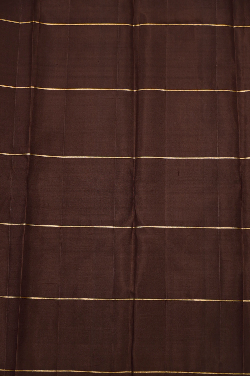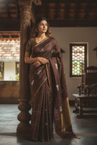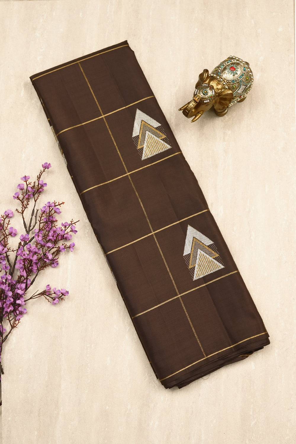 Discover understated beauty with this gorgeous chocolate brown silk saree. Its earthy, warm tone is beautifully complemented by delicate geometric patterns that add visual interest without overpowering the rich color. Unstitched blouse attached.