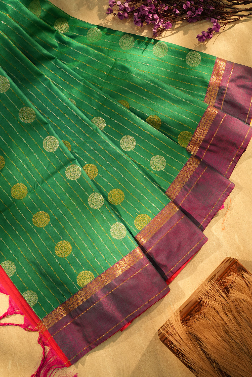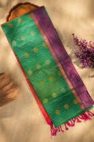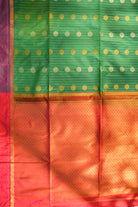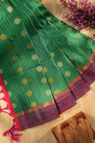 A masterpiece of weaving, this saree showcases a lush green hue paired with a deep magenta-purple border. The intricate gold buttas are scattered across the body, complemented by a lustrous finish that catches the light beautifully. A graceful addition to your ethnic wardrobe that blends heritage with comfort. Unstitched blouse attached.