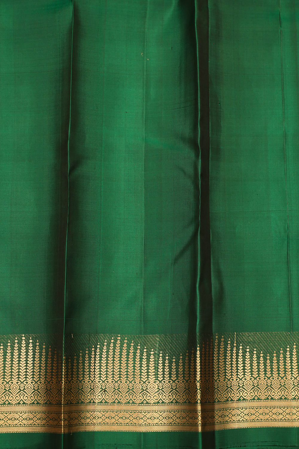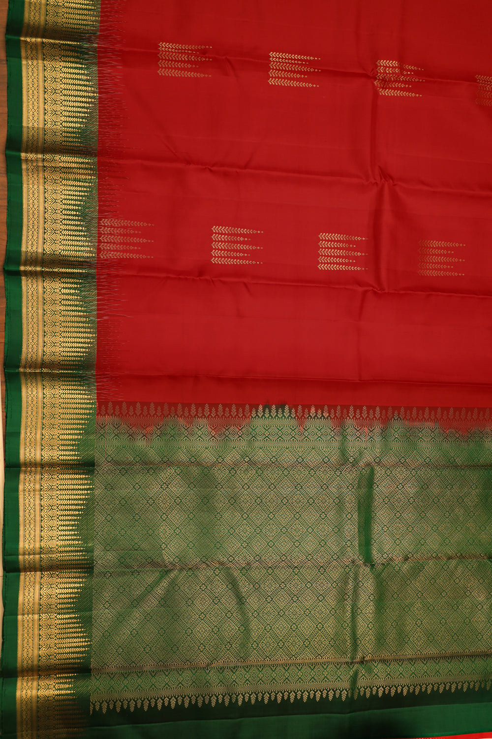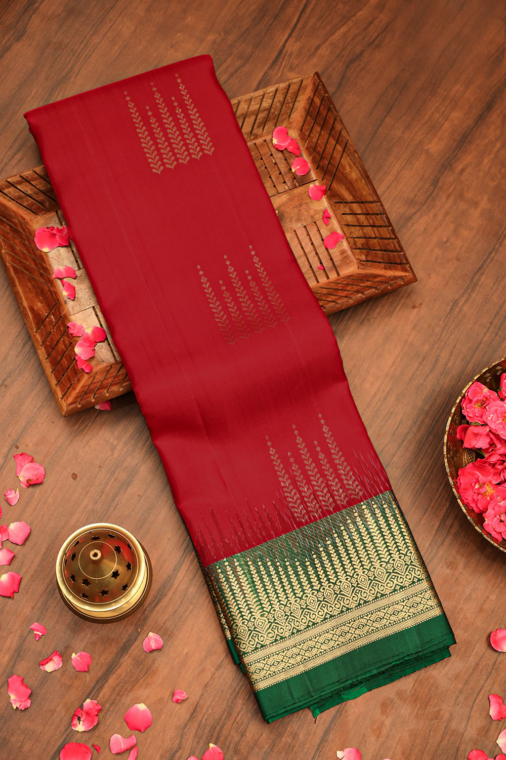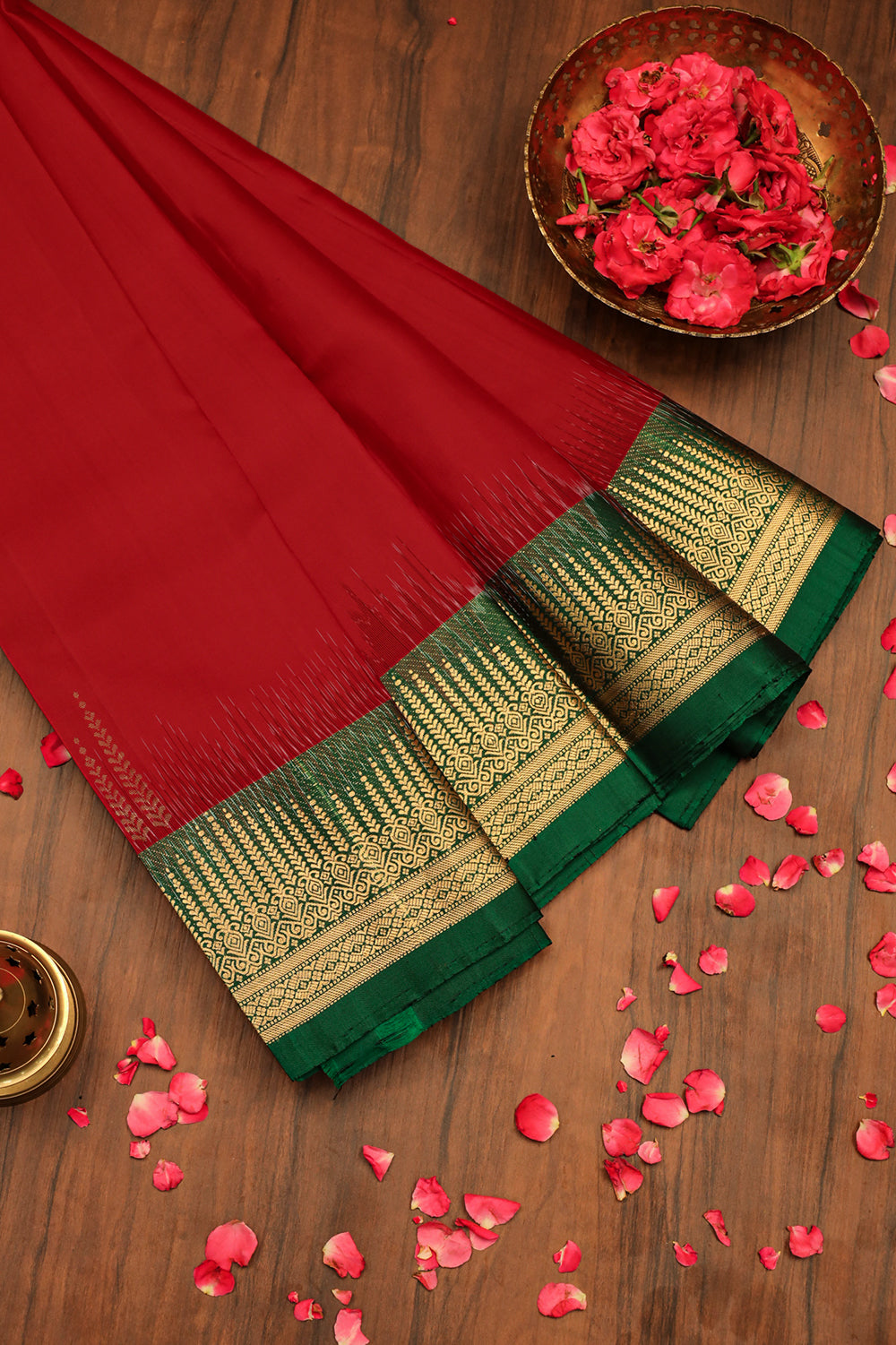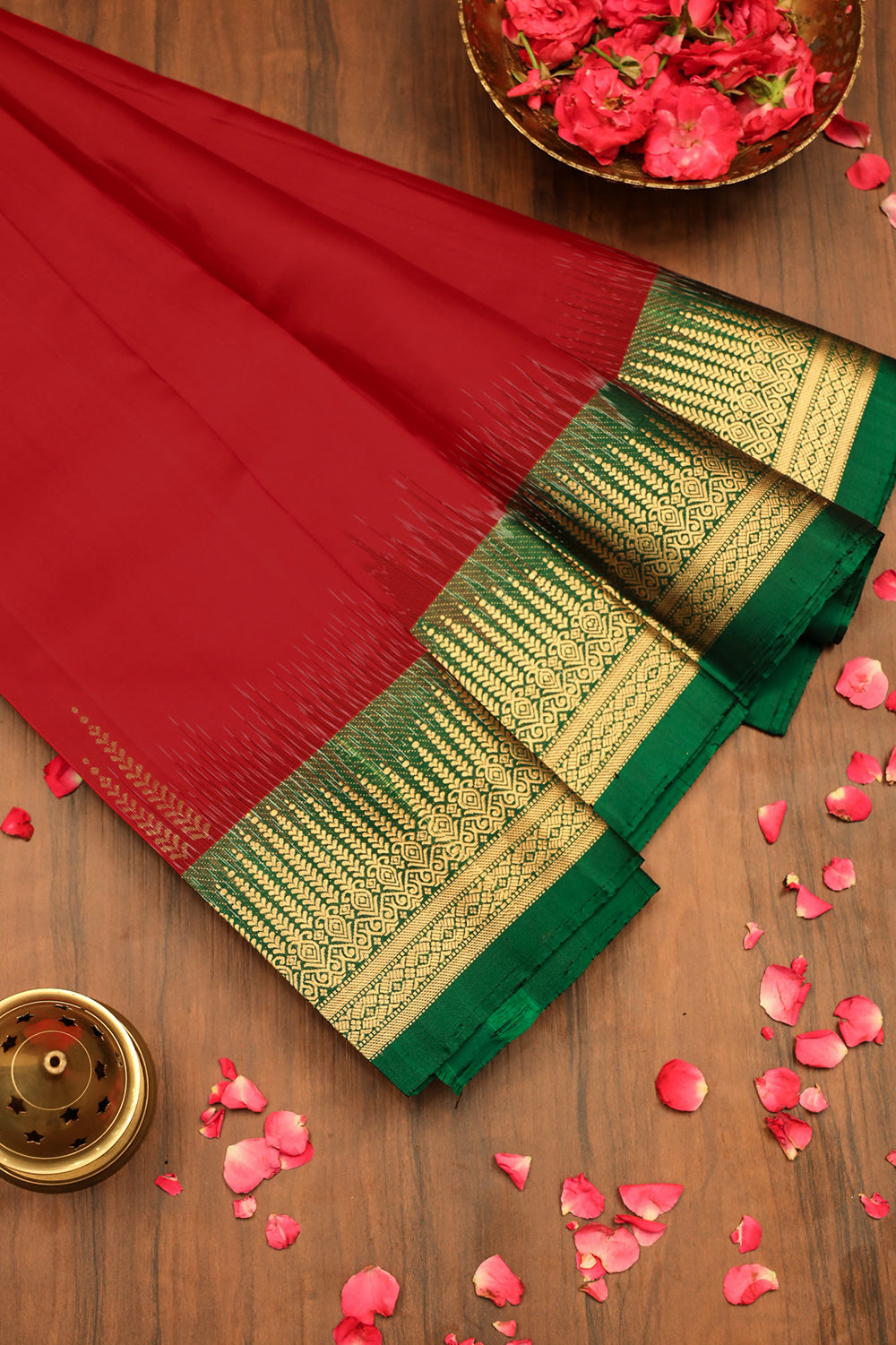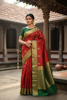 Celebrate in style with this beautiful red silk saree. The contrasting green border is adorned with detailed gold weaving. This classic combination offers a timeless and graceful look. Unstitched blouse attached.
