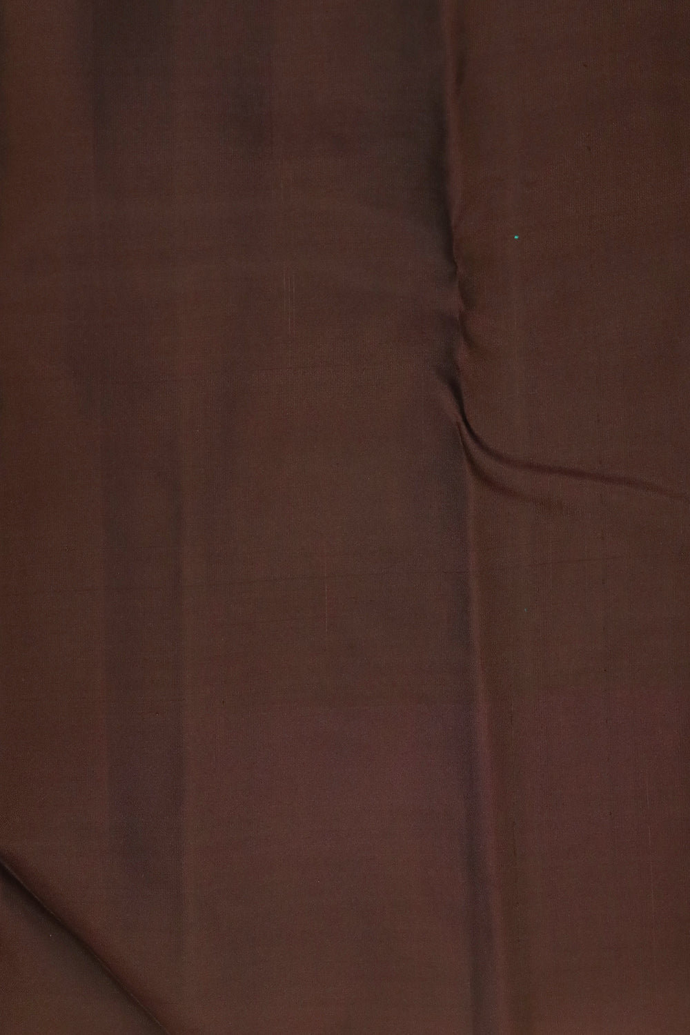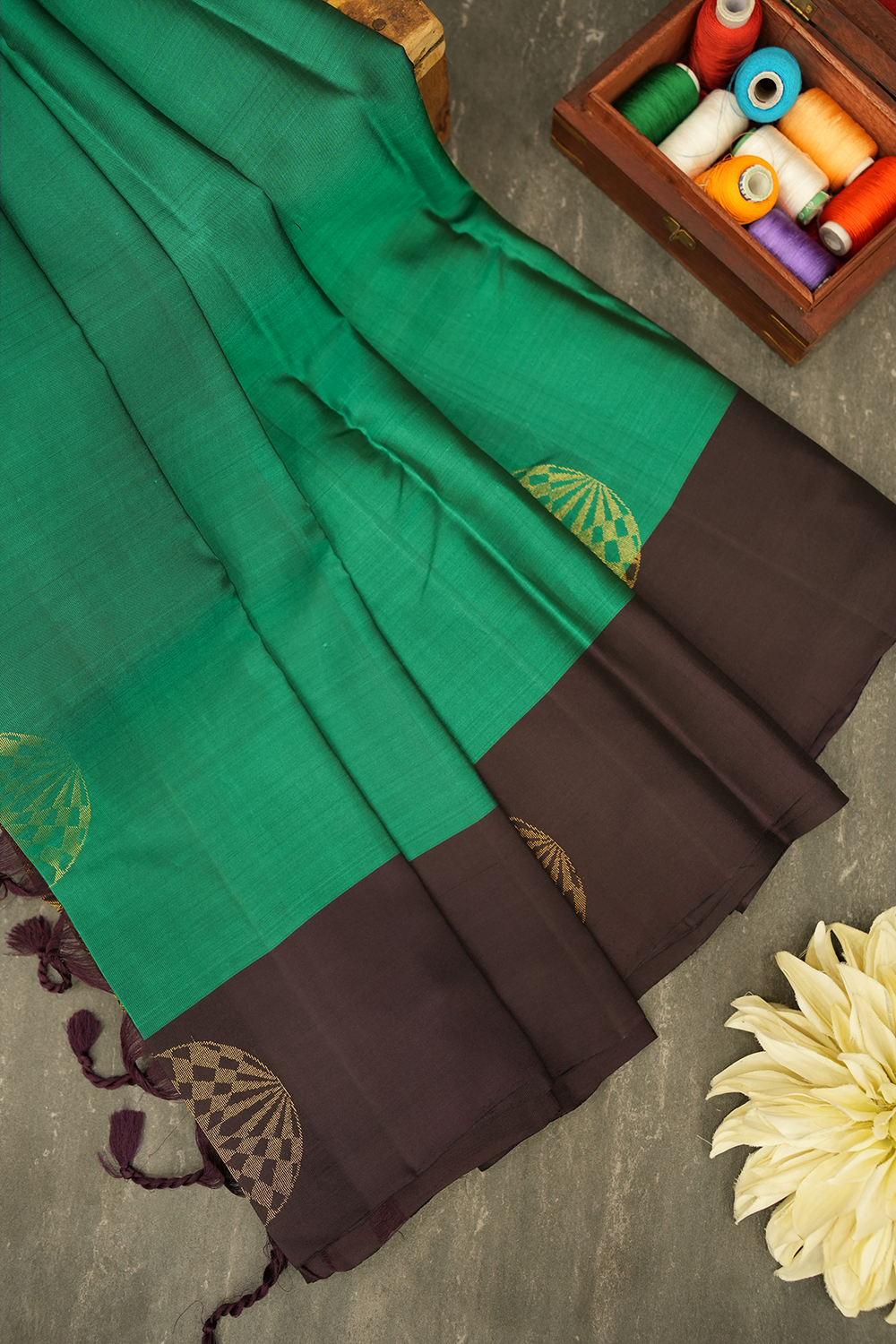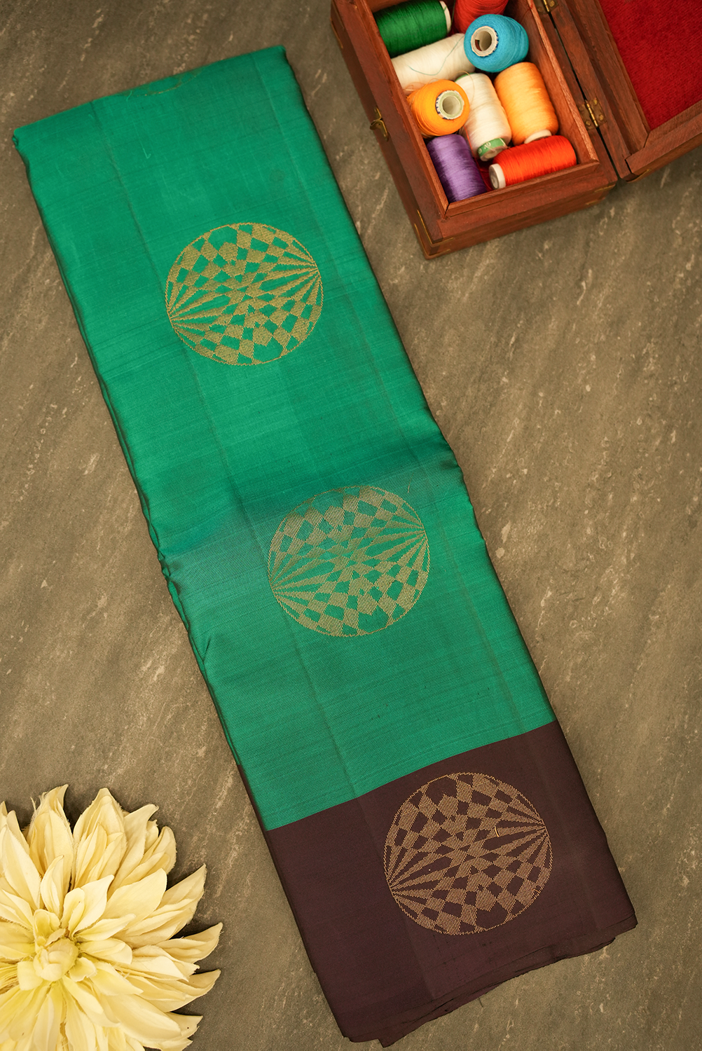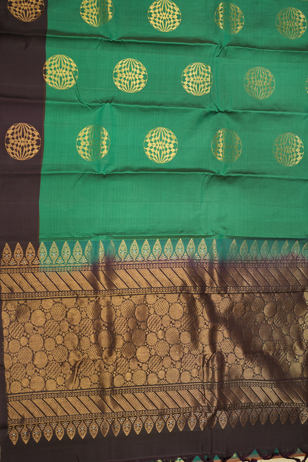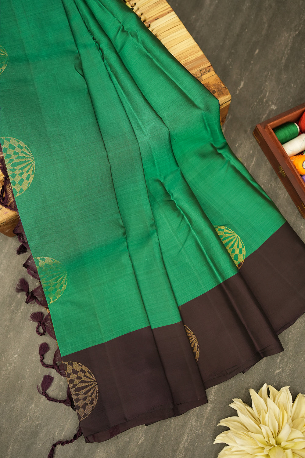 Green Soft Silk Saree having a lovely unique geometrical round designed motifs with coper zari all over the body. deep violet with copper zari motifs designed lovely border. unstitched blouse attached.
