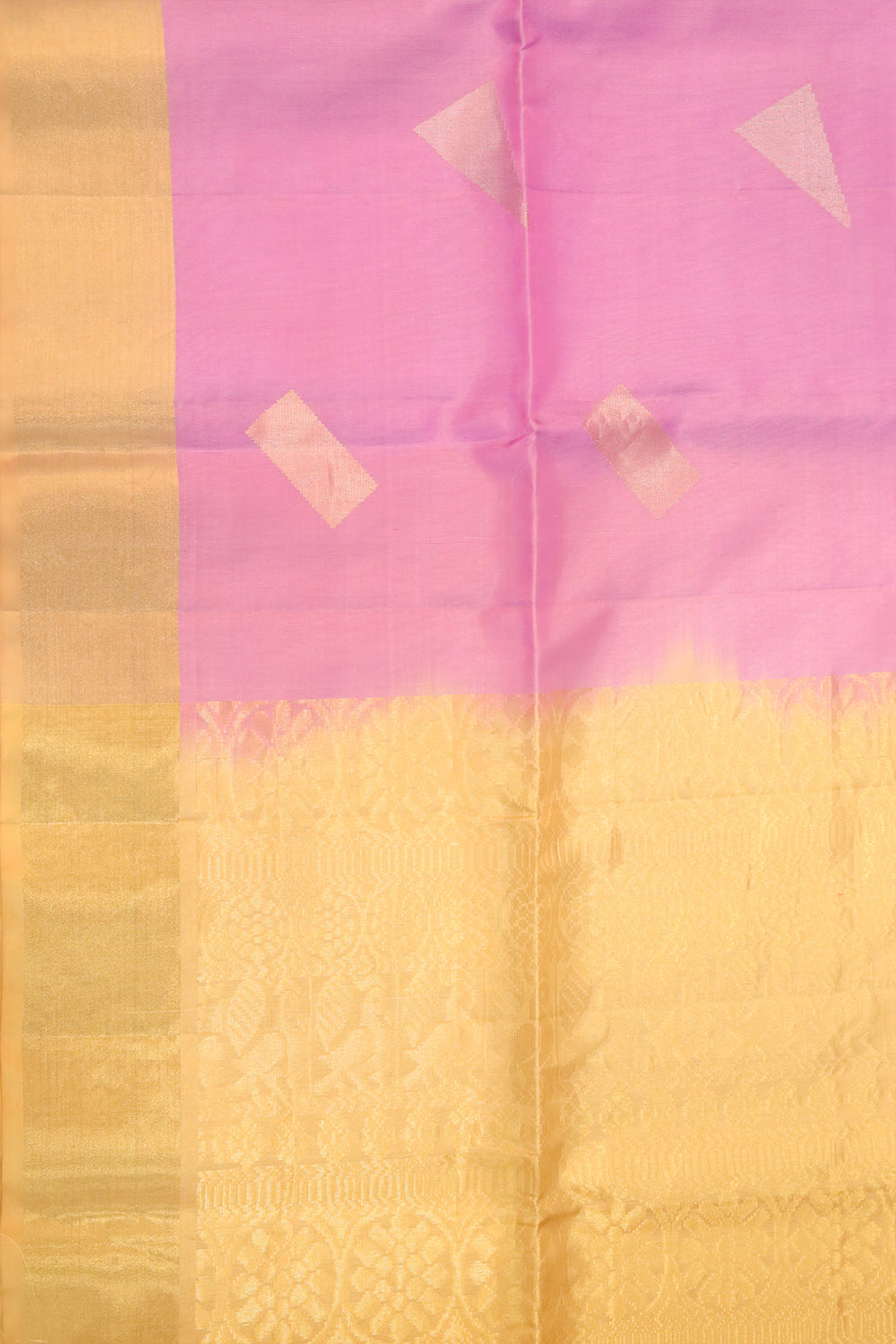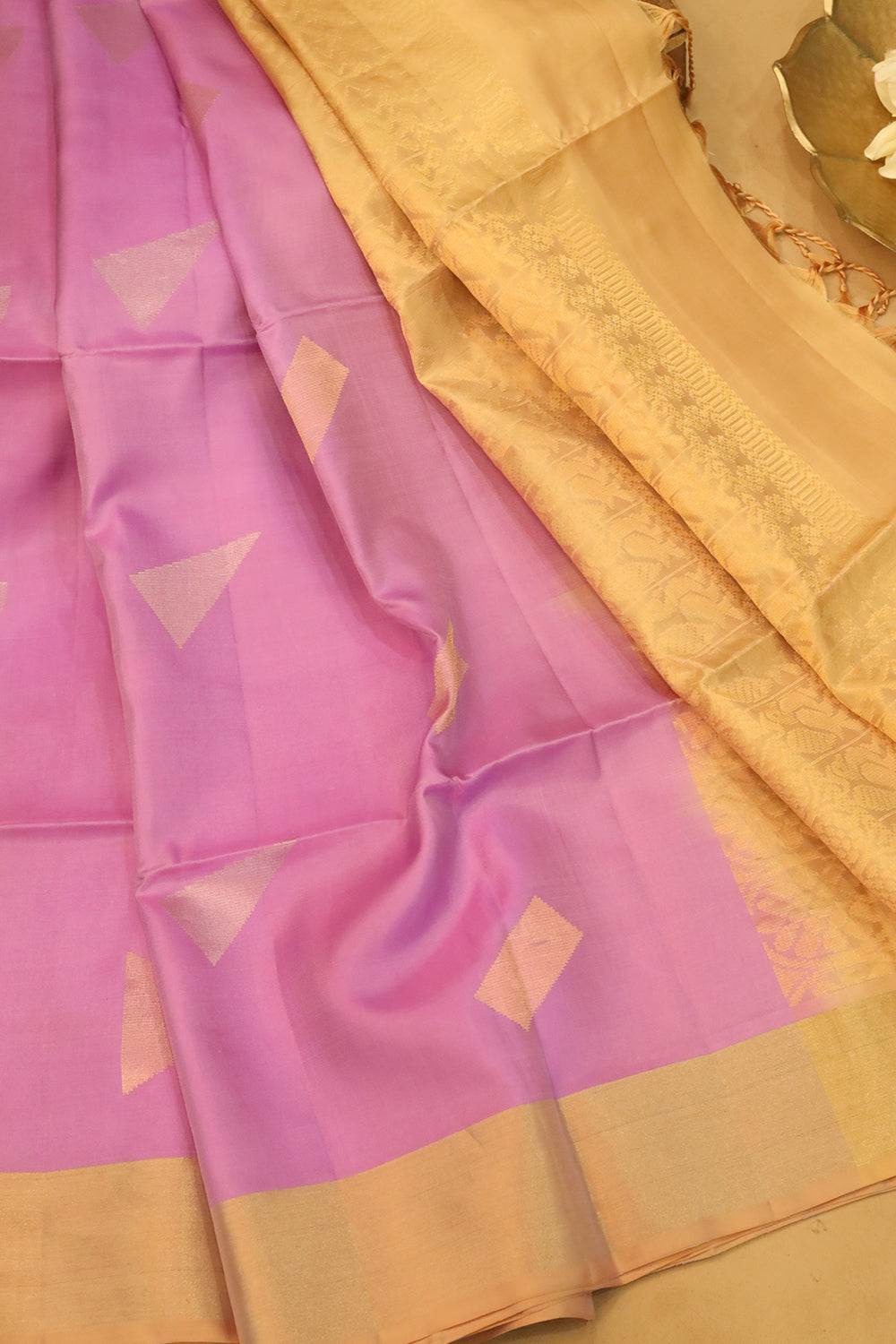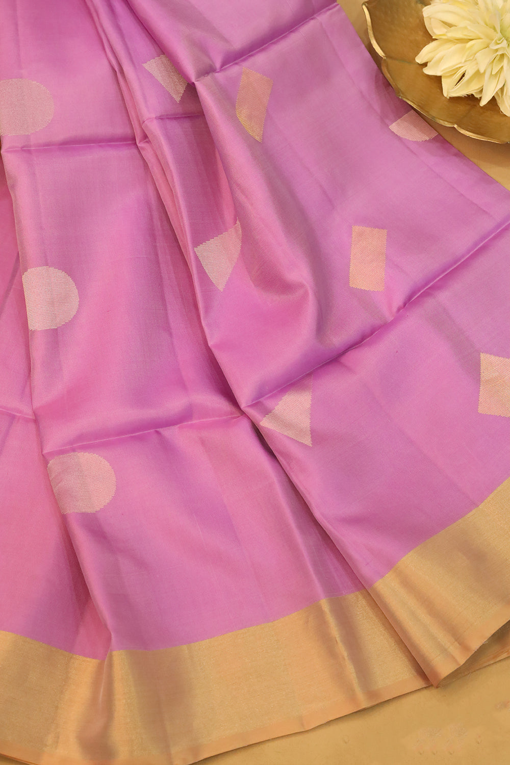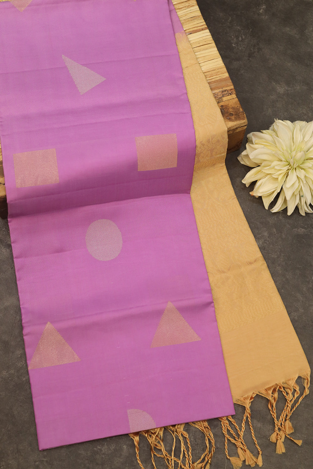 Lavender Soft Silk Saree having a lovely multi shapes designed motifs with coper zari all over the body. Golden zari lovely border. unstitched blouse attached.