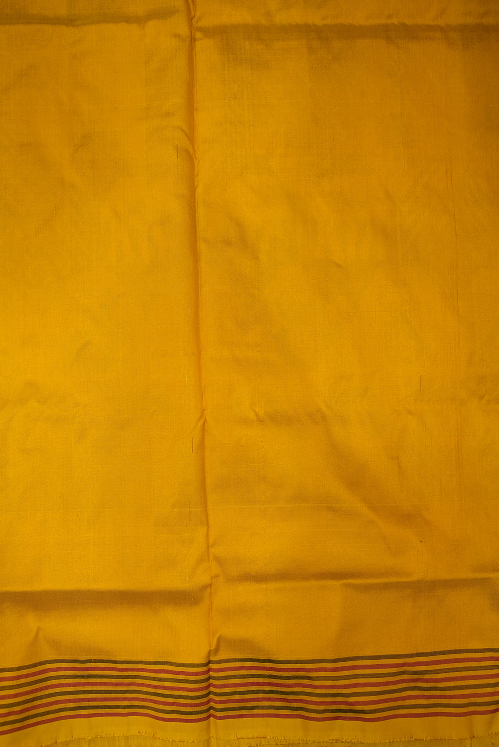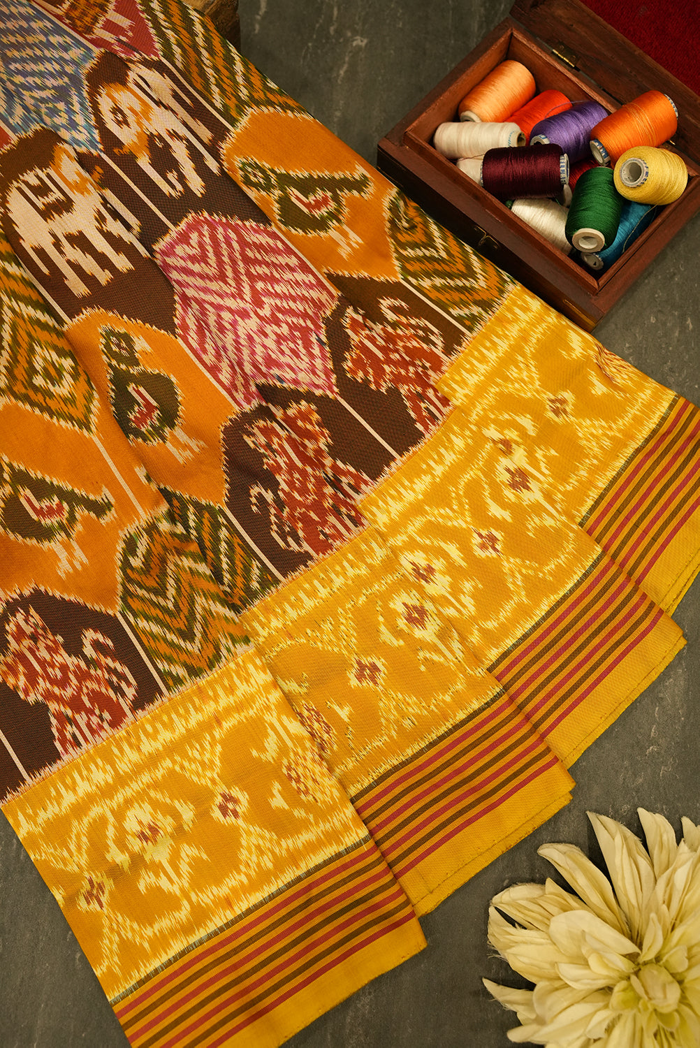 This exquisite Ikat silk saree features a rich, earthy color palette with a vibrant pallu adorned with intricate elephant motifs. The body of the saree is a striking mustard yellow, complemented by a contrast border with fine striped patterns. Unstitched blouse attached.