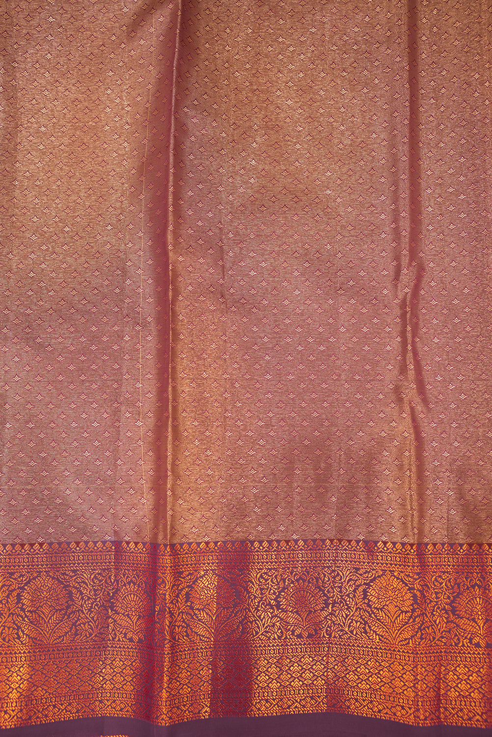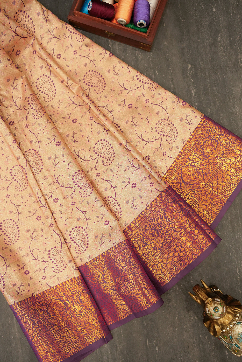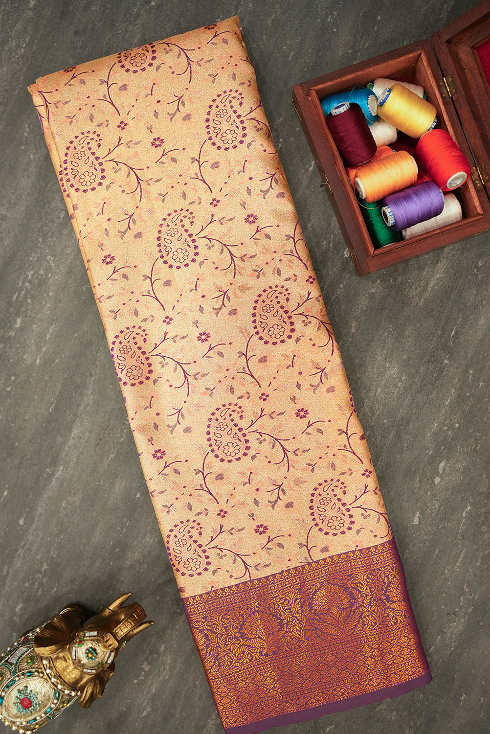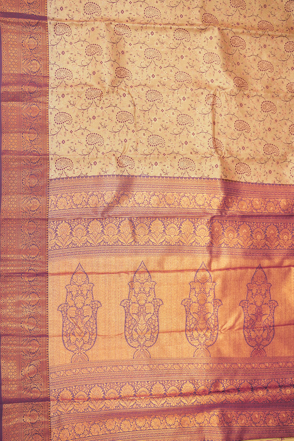 A beautiful silk saree in a warm golden-beige shade with a woven mauve floral and paisley design. It features a bold, contrasting purple border with detailed brocade work, making it a classic choice for festive wear. Unstitched blouse attached.