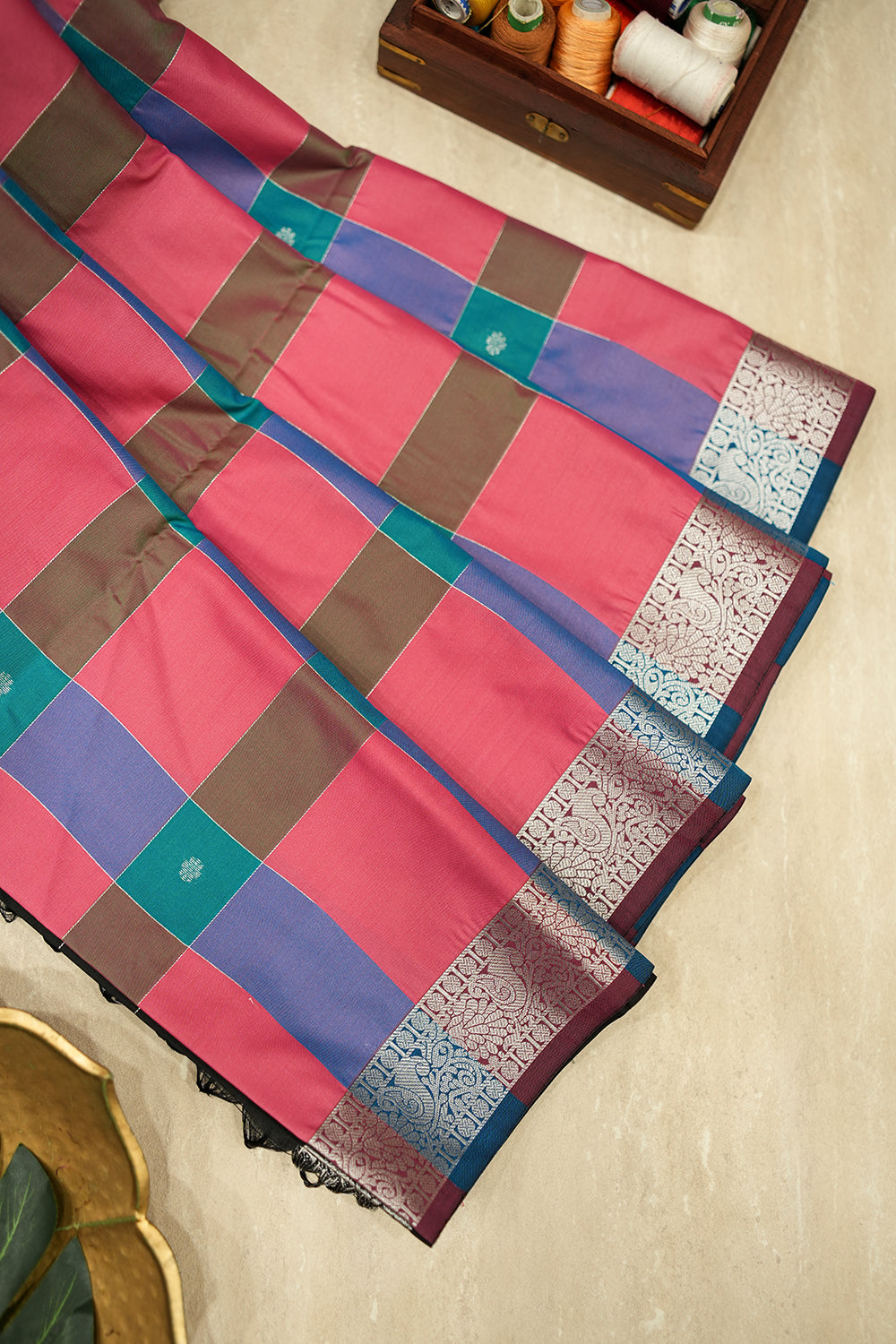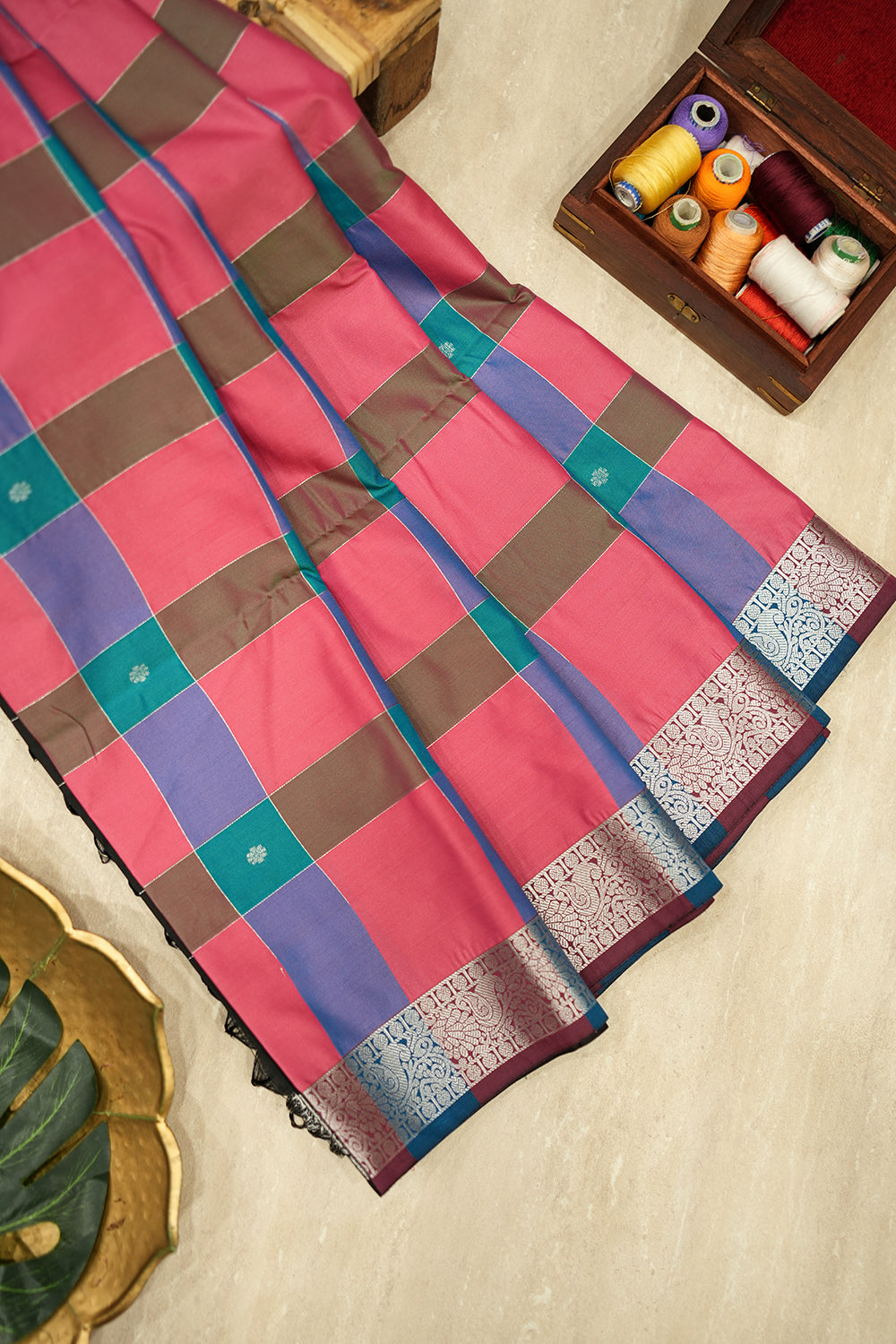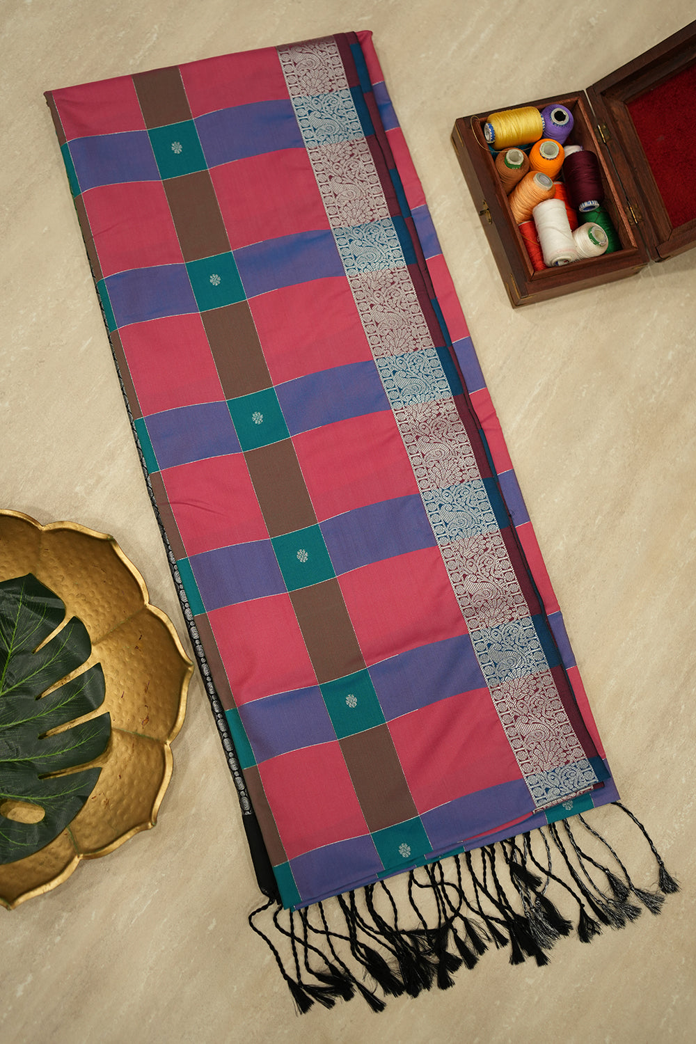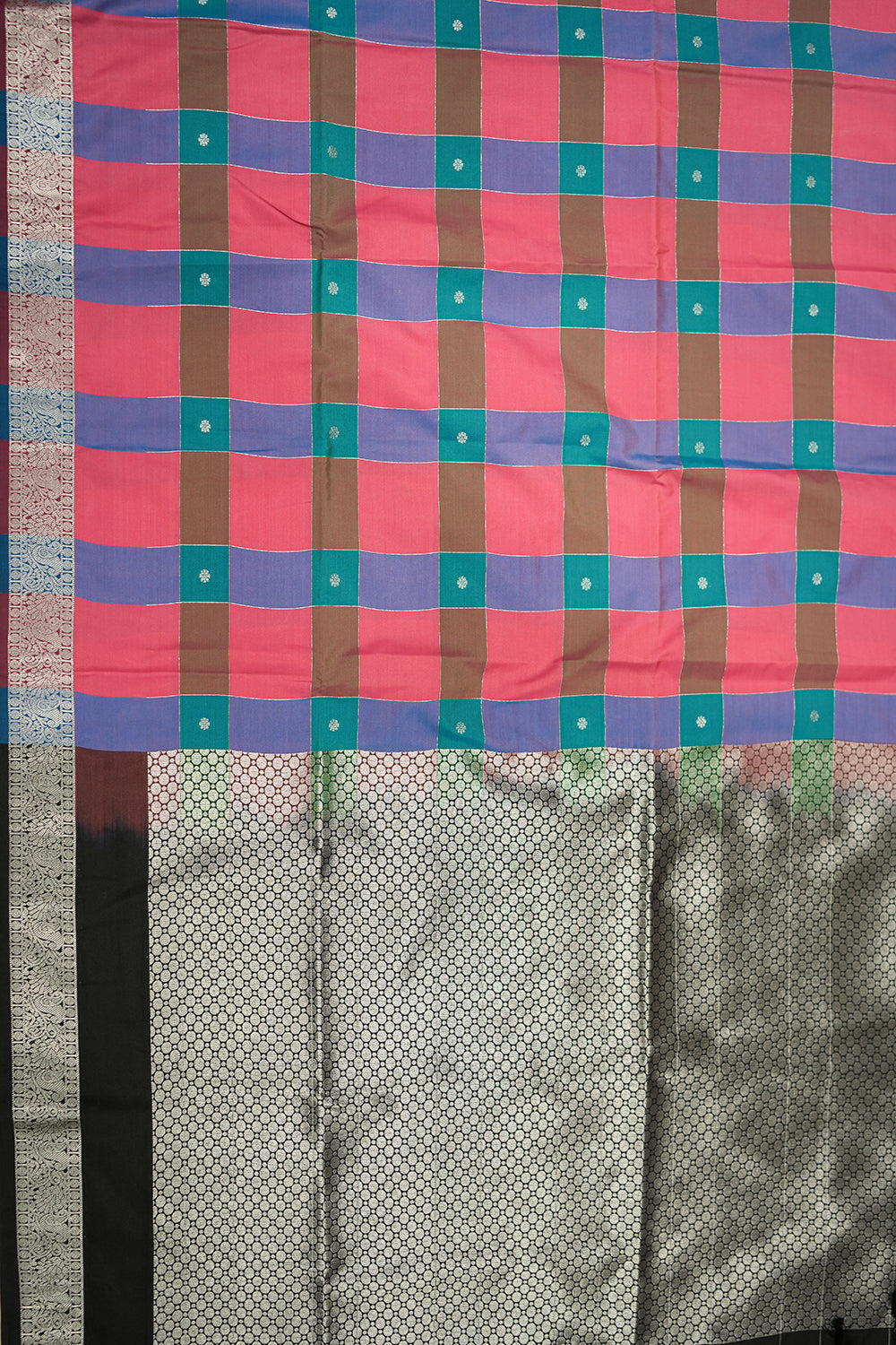 Featuring a vibrant multi-color checked body and an elegant black pallu with intricate silver zari work. Unstitched blouse attached.
