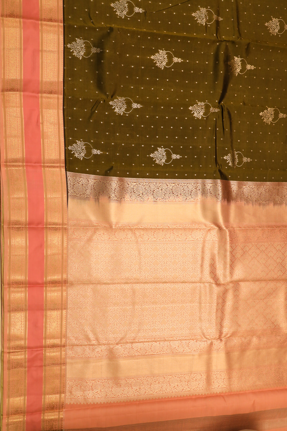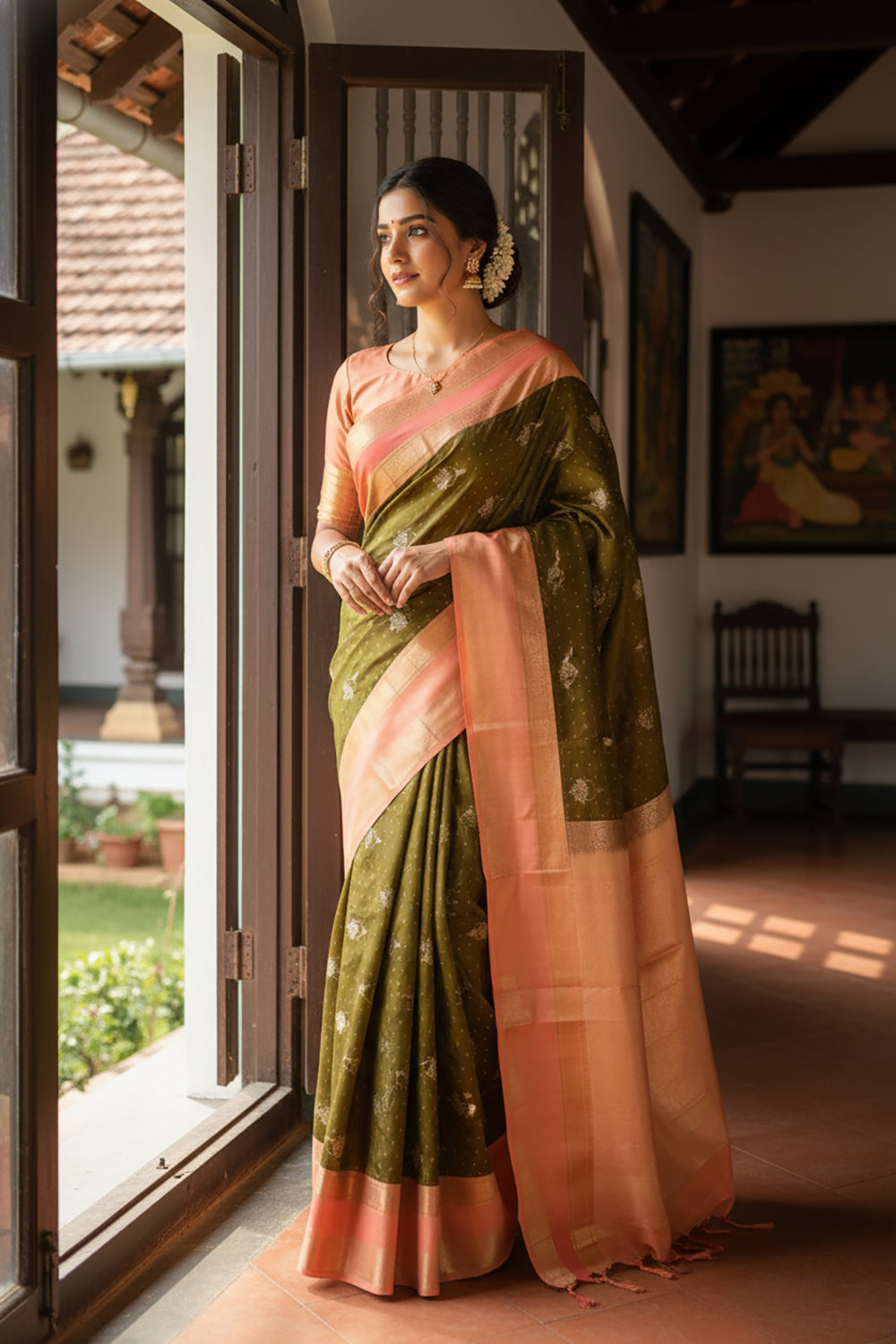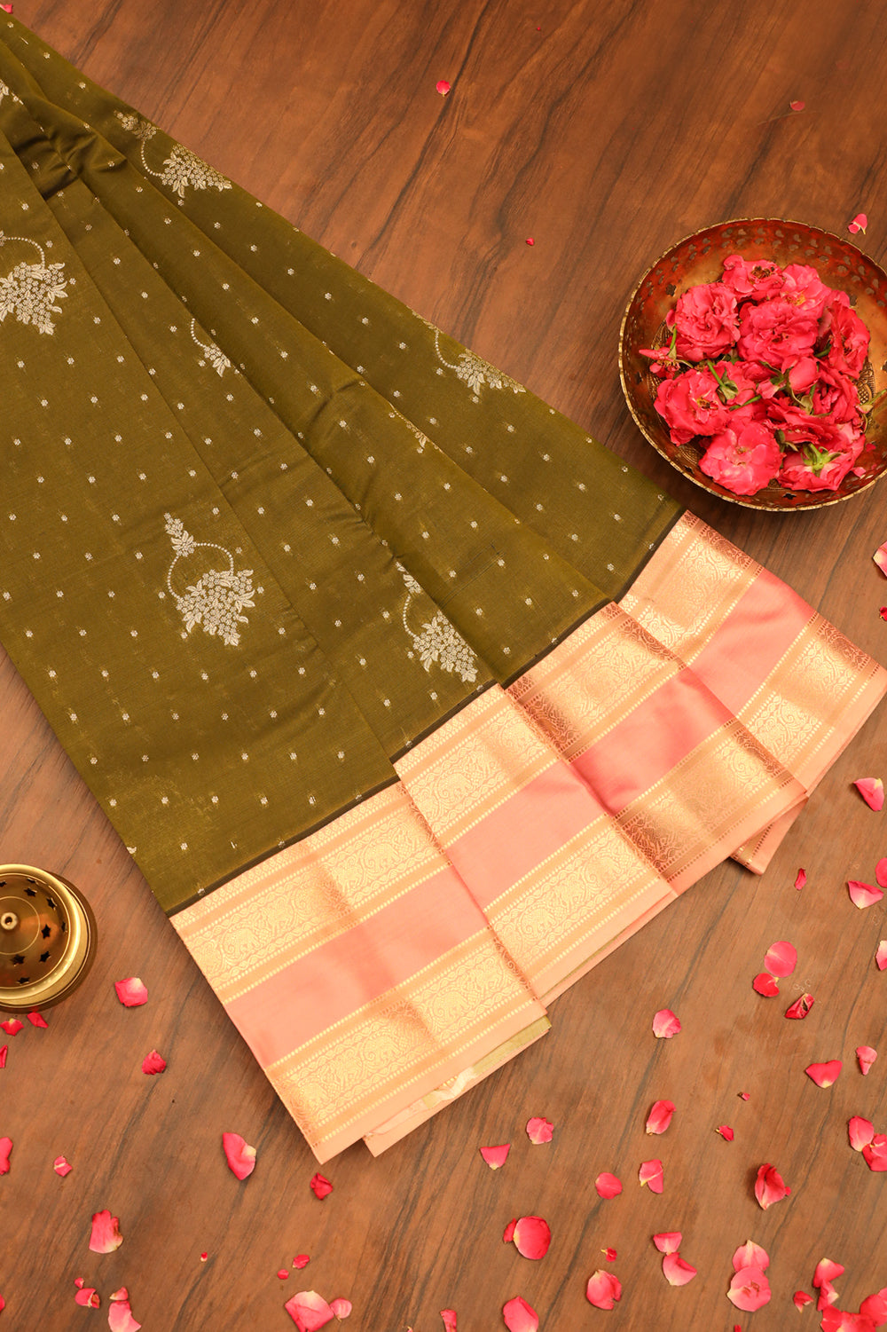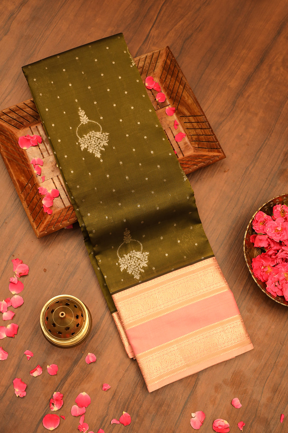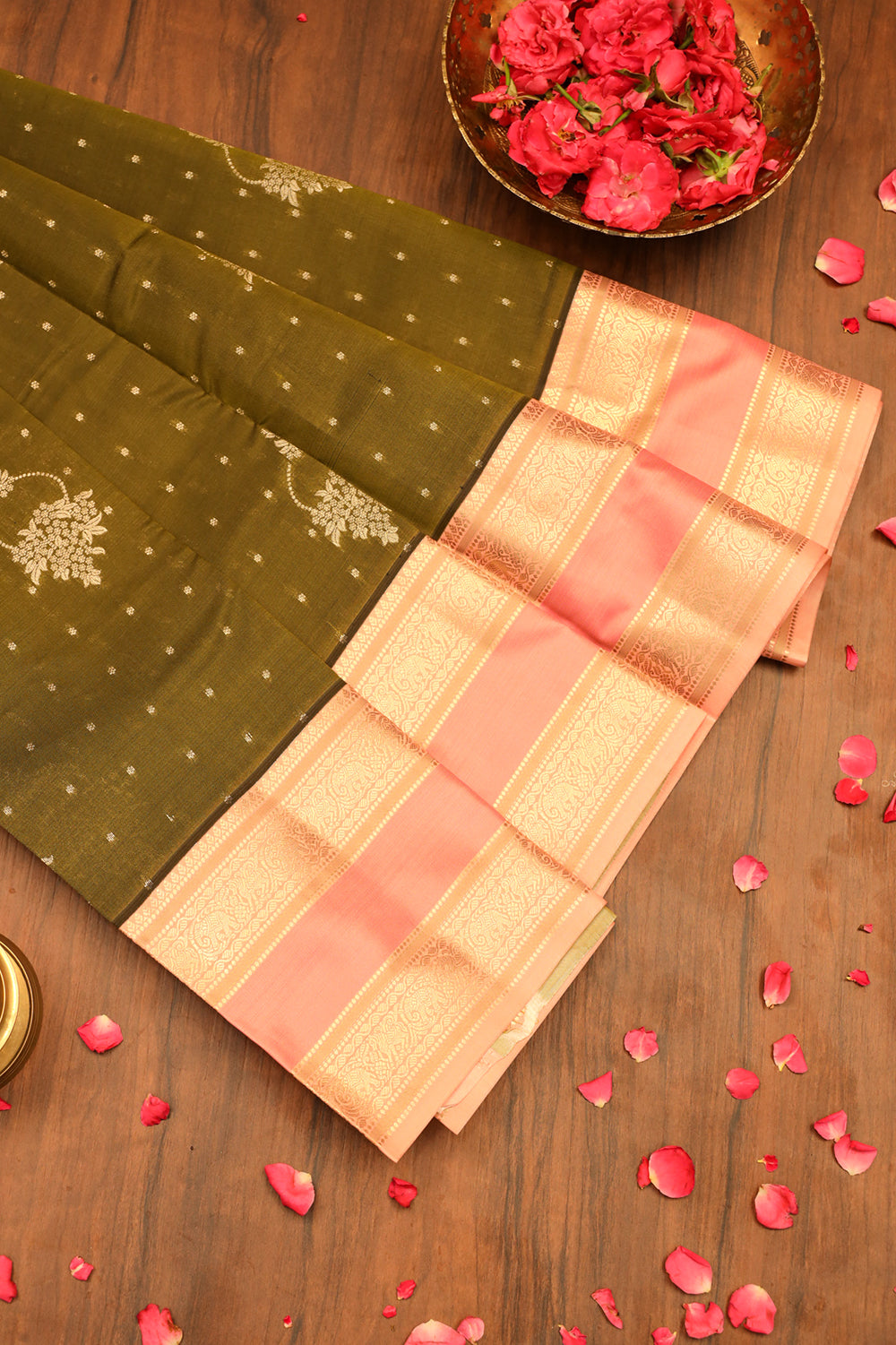 Drape yourself in the timeless beauty of this silk saree. Featuring a rich olive green body with delicate motifs and a stunning contrasting pink border. Perfect for festive occasions and celebrations. Unstitched blouse attached.