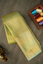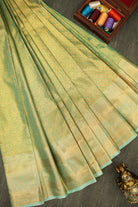 This luxurious silk saree features a beautiful pastel green body woven with an intricate golden zari brocade pattern. The pallu and border are a vibrant gold, also adorned with detailed zari designs, creating a rich and opulent look. This saree is perfect for weddings, festive occasions, and special events.