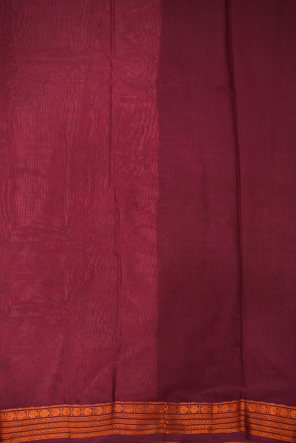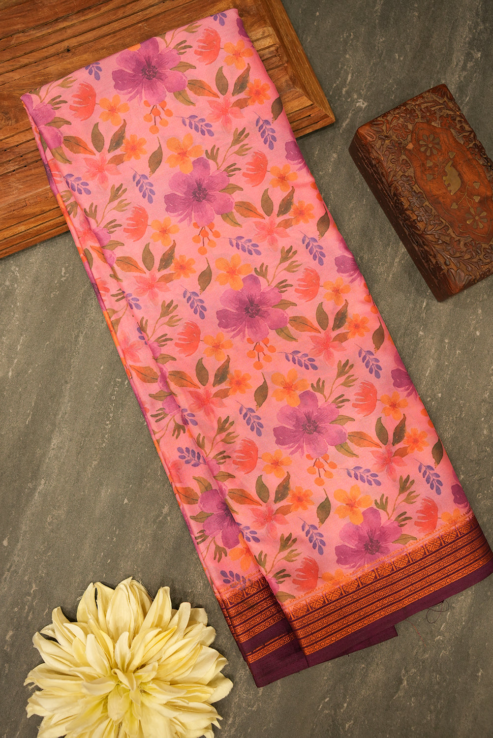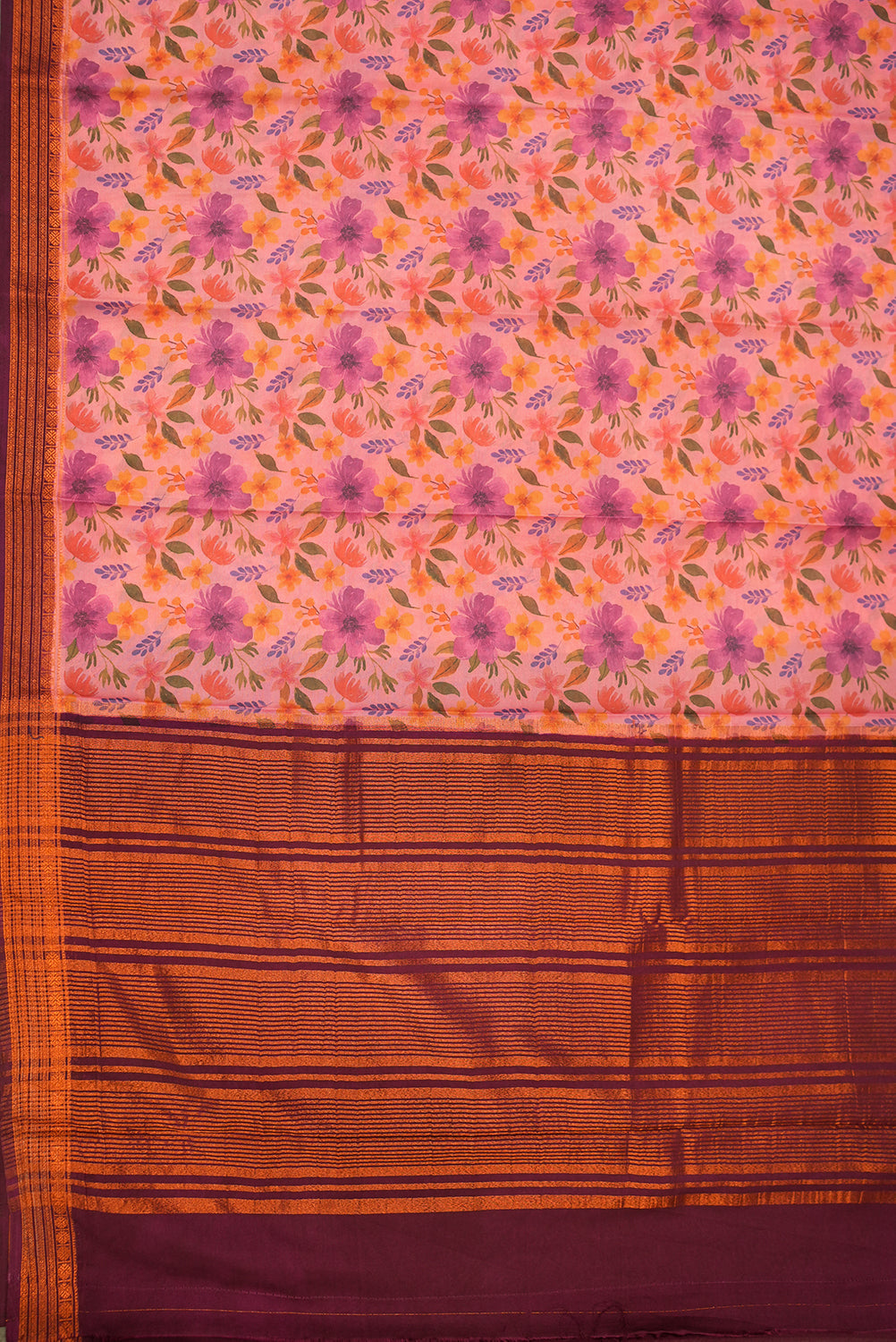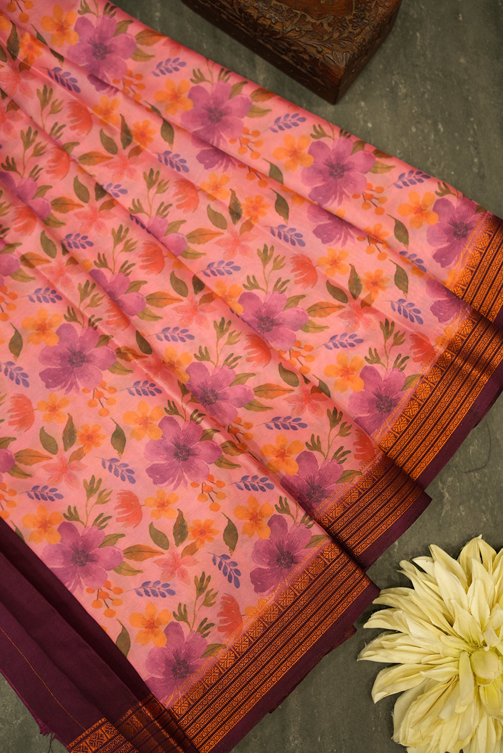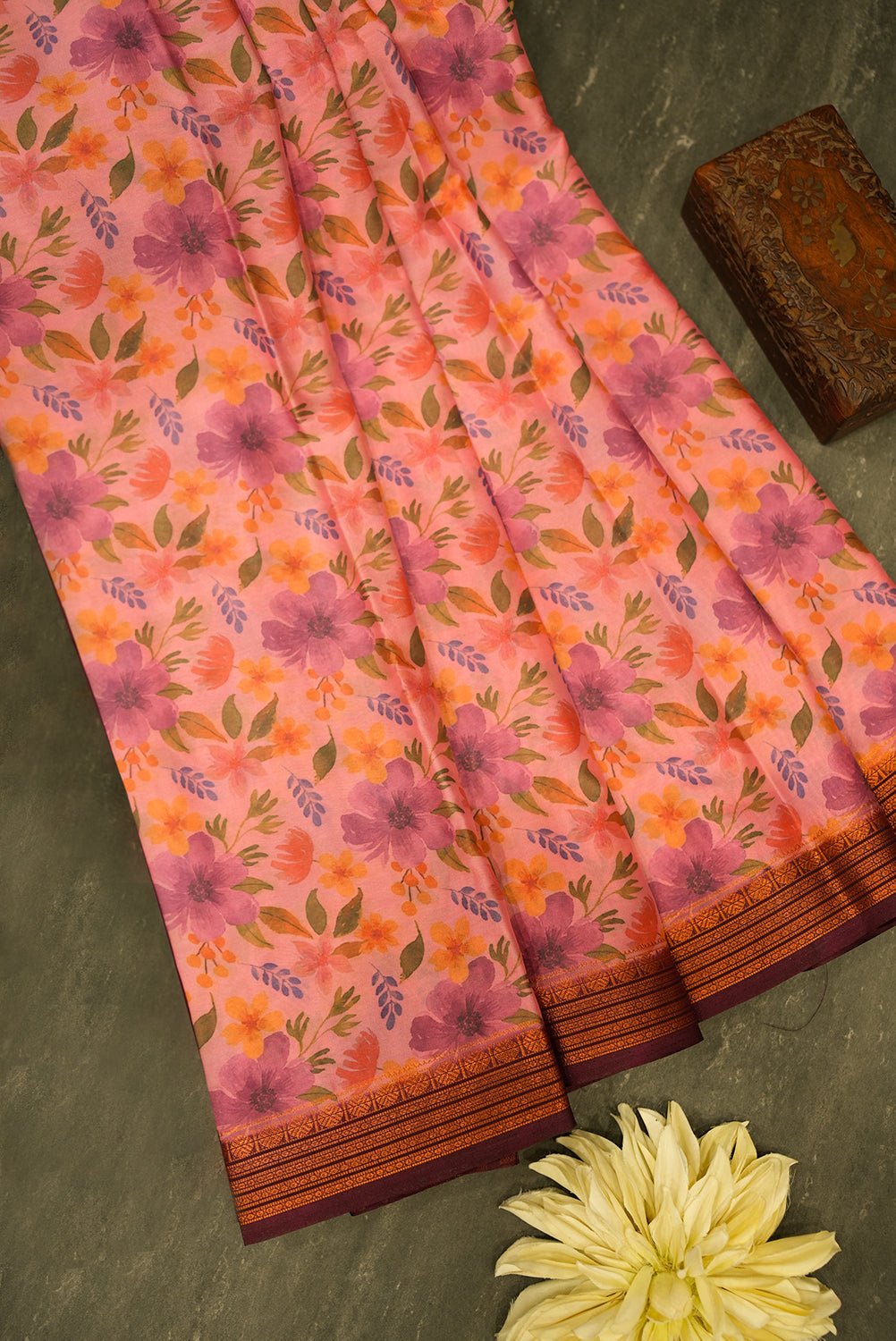 An elegant Mysore silk saree with a lovely all-over floral pattern in muted purple and orange tones. The saree's body is a charming pastel pink, beautifully complemented by a classic maroon border. Unstitched blouse attached.