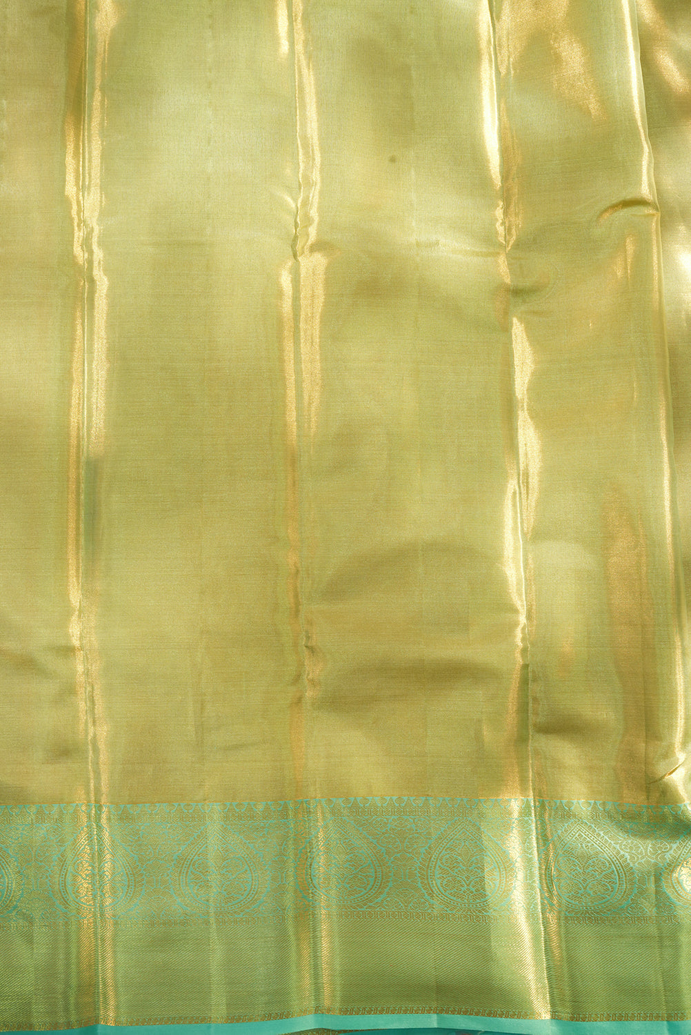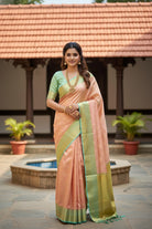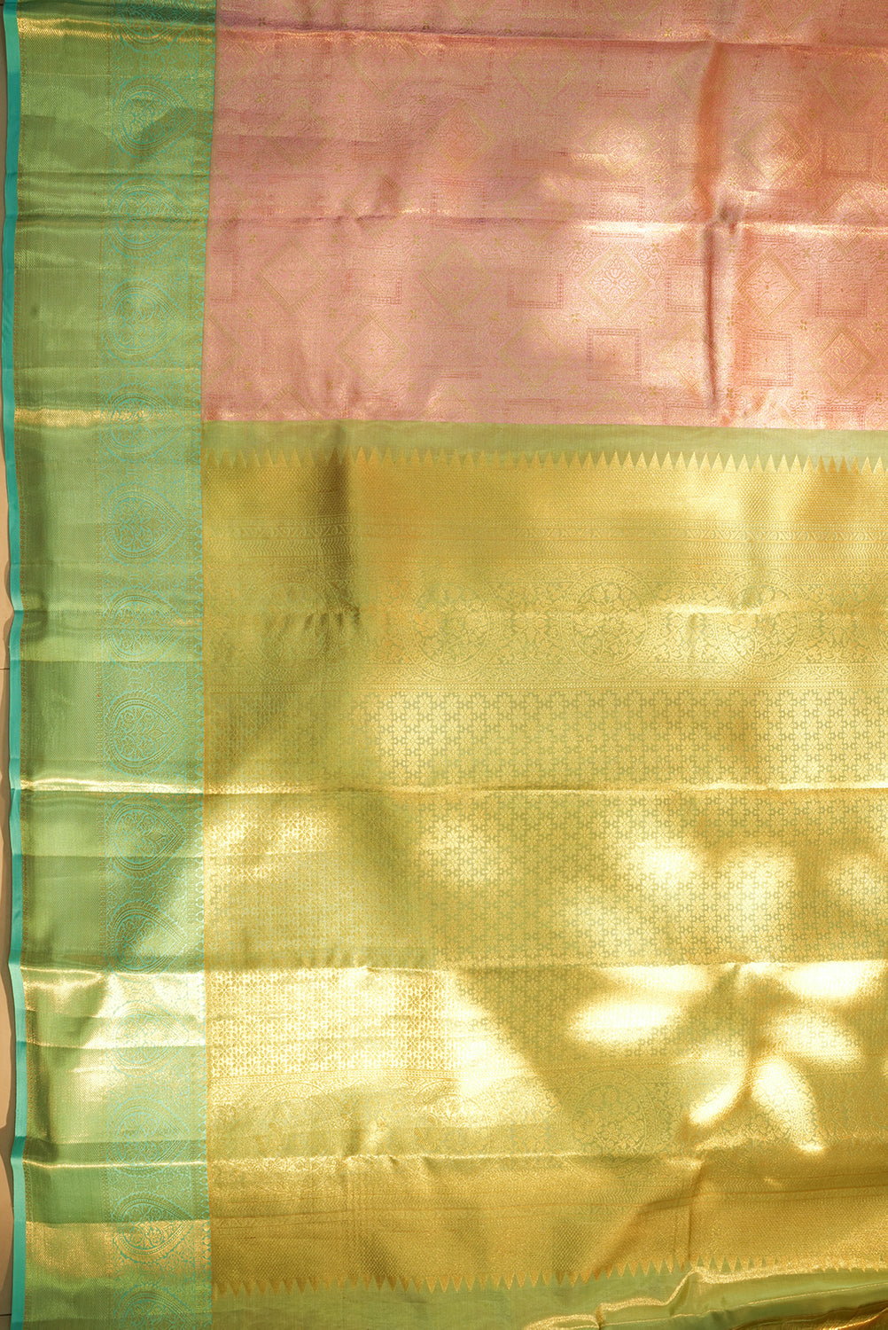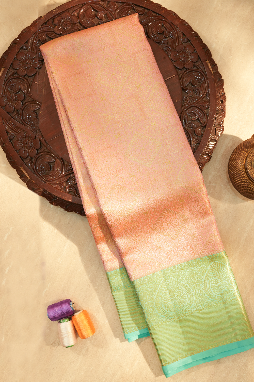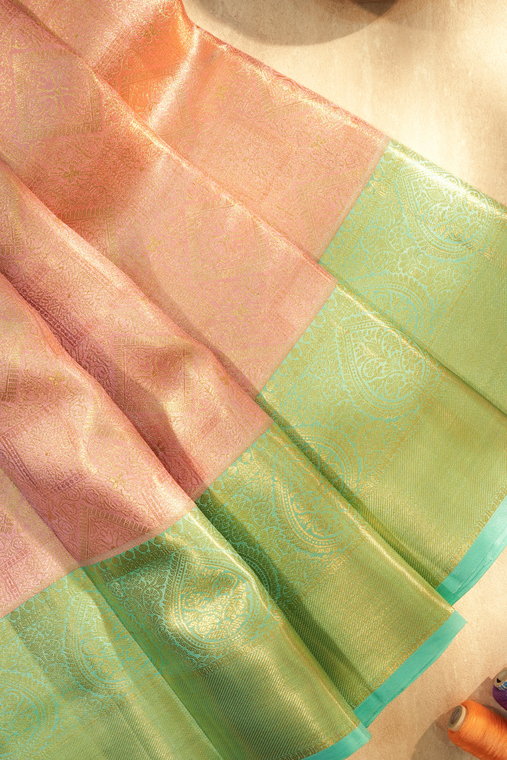 Embrace timeless elegance with this stunning silk saree. The body shimmers in a sophisticated peach-pink or blush pink, woven with subtle golden zari. It is beautifully contrasted by a vibrant pistachio green border, featuring intricate traditional motifs. Unstitched blouse attached.