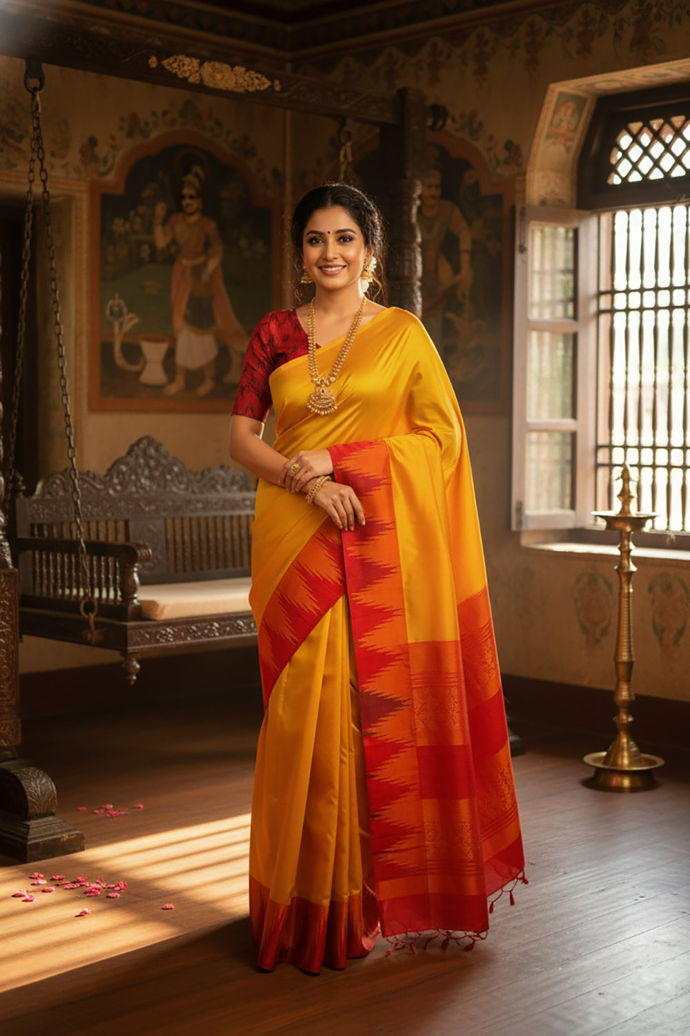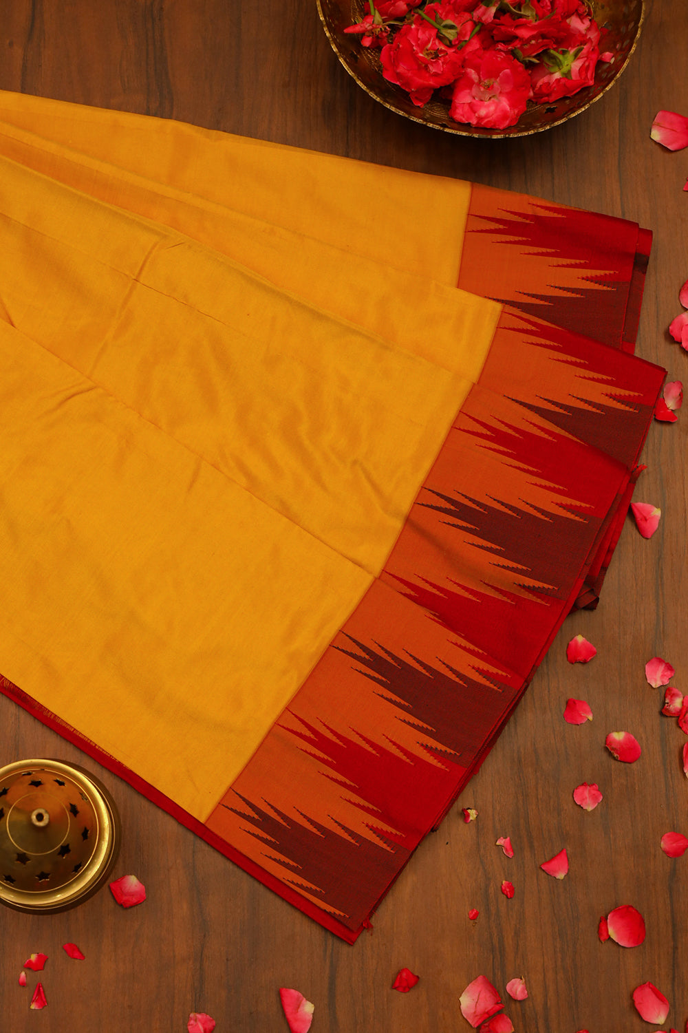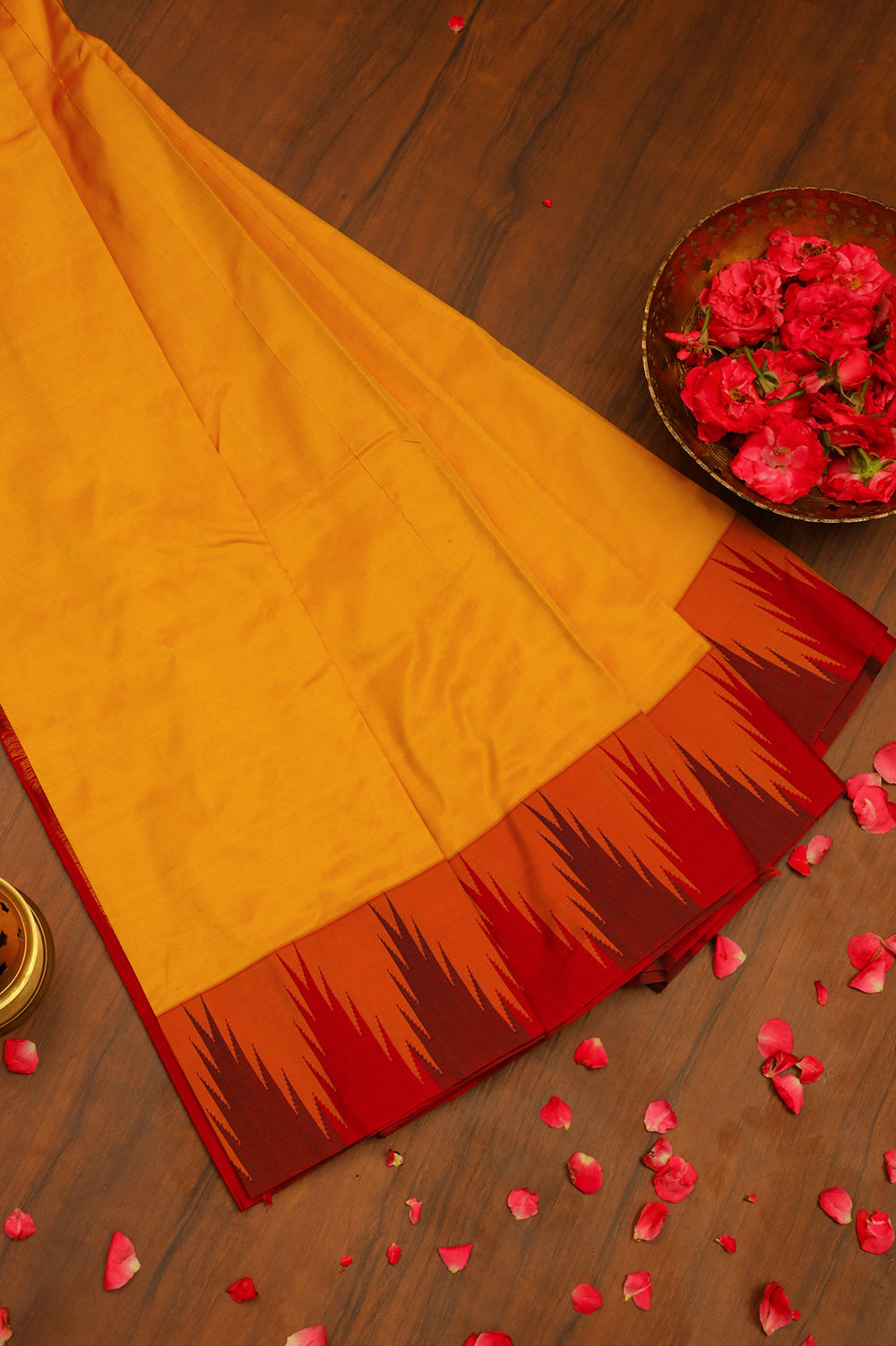 Dazzling yellow silk drapes beautifully. Features a vibrant border in striking red, orange, and brown Gopuram patterns. A perfect blend of tradition and contemporary style. Unstitched blouse attached.