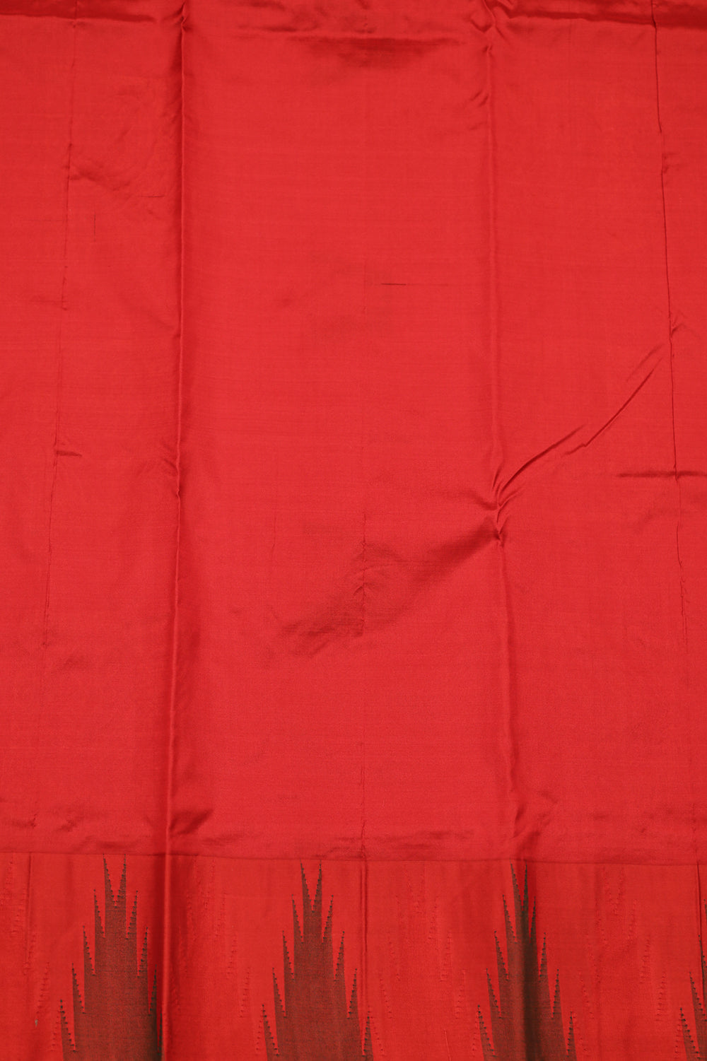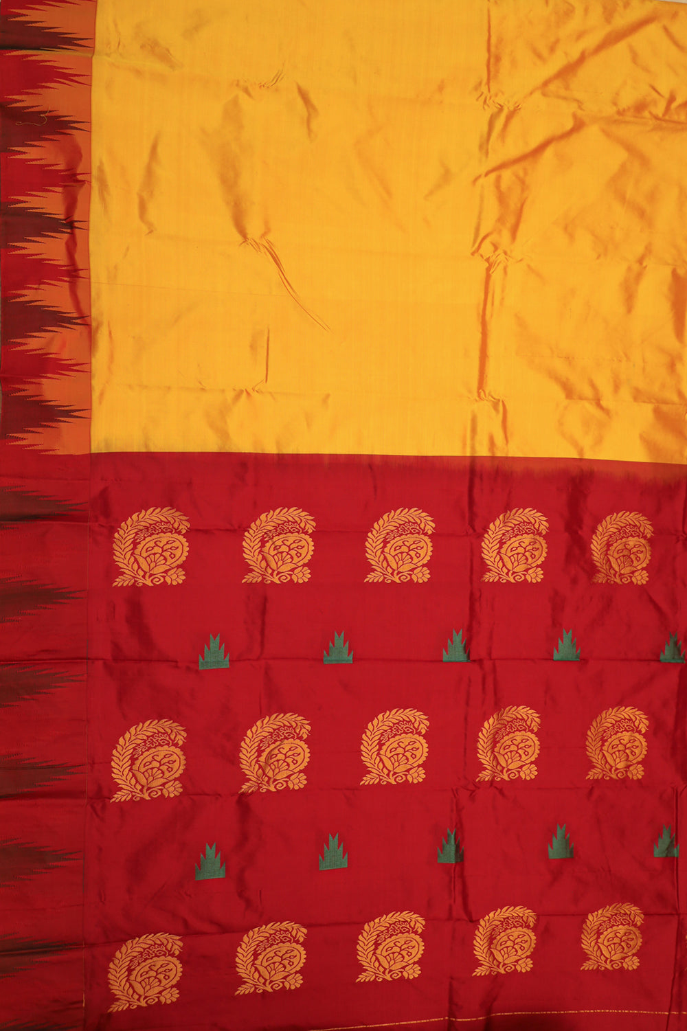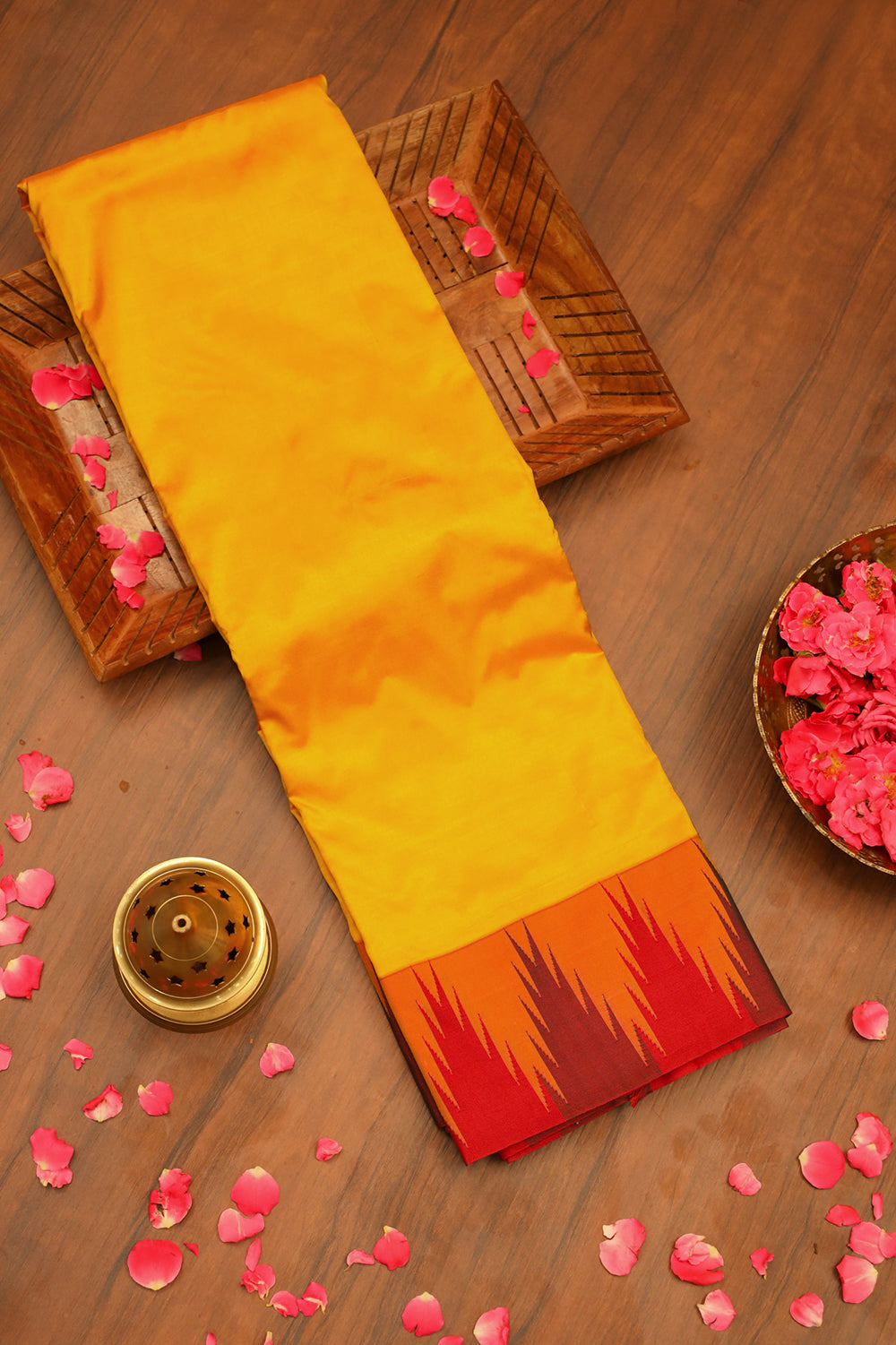 Dazzling yellow silk drapes beautifully. Features a vibrant border in striking red, orange, and brown Gopuram patterns. A perfect blend of tradition and contemporary style. Unstitched blouse attached.