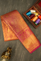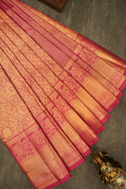 This stunning silk saree features a vibrant rani pink body, richly woven with intricate golden zari motifs. The detailed floral patterns cover the body of the saree, while the wide border and pallu are adorned with a classic golden zari brocade design. This luxurious and heavy saree is a perfect choice for weddings, grand celebrations, and festive occasions where you want to make a regal statement.