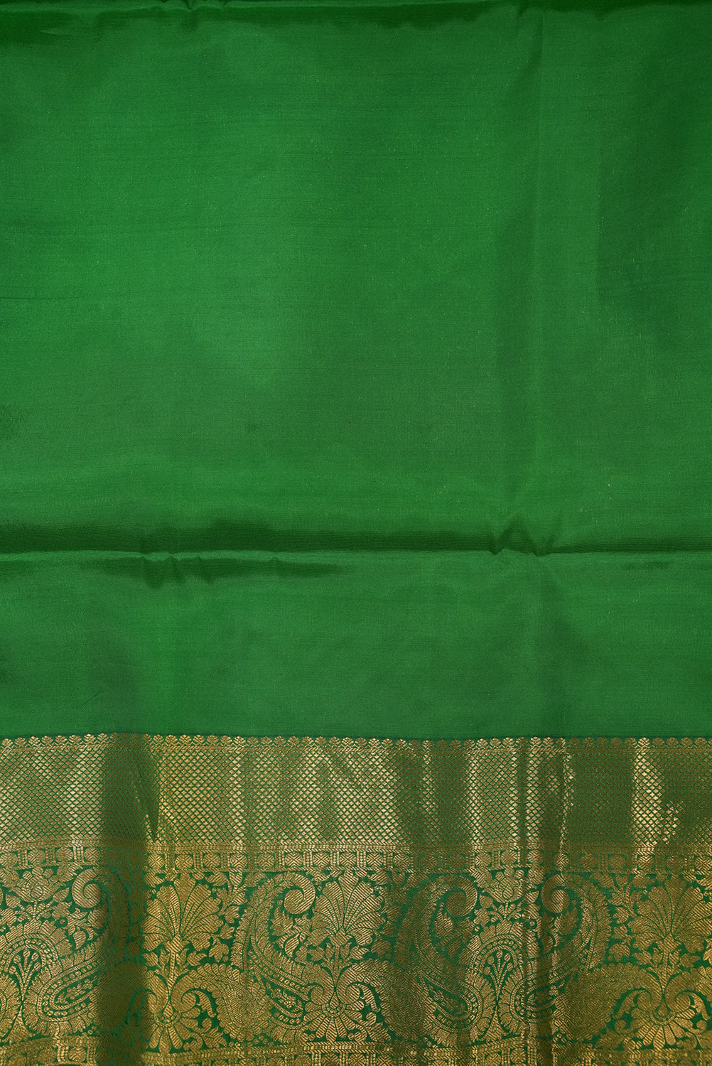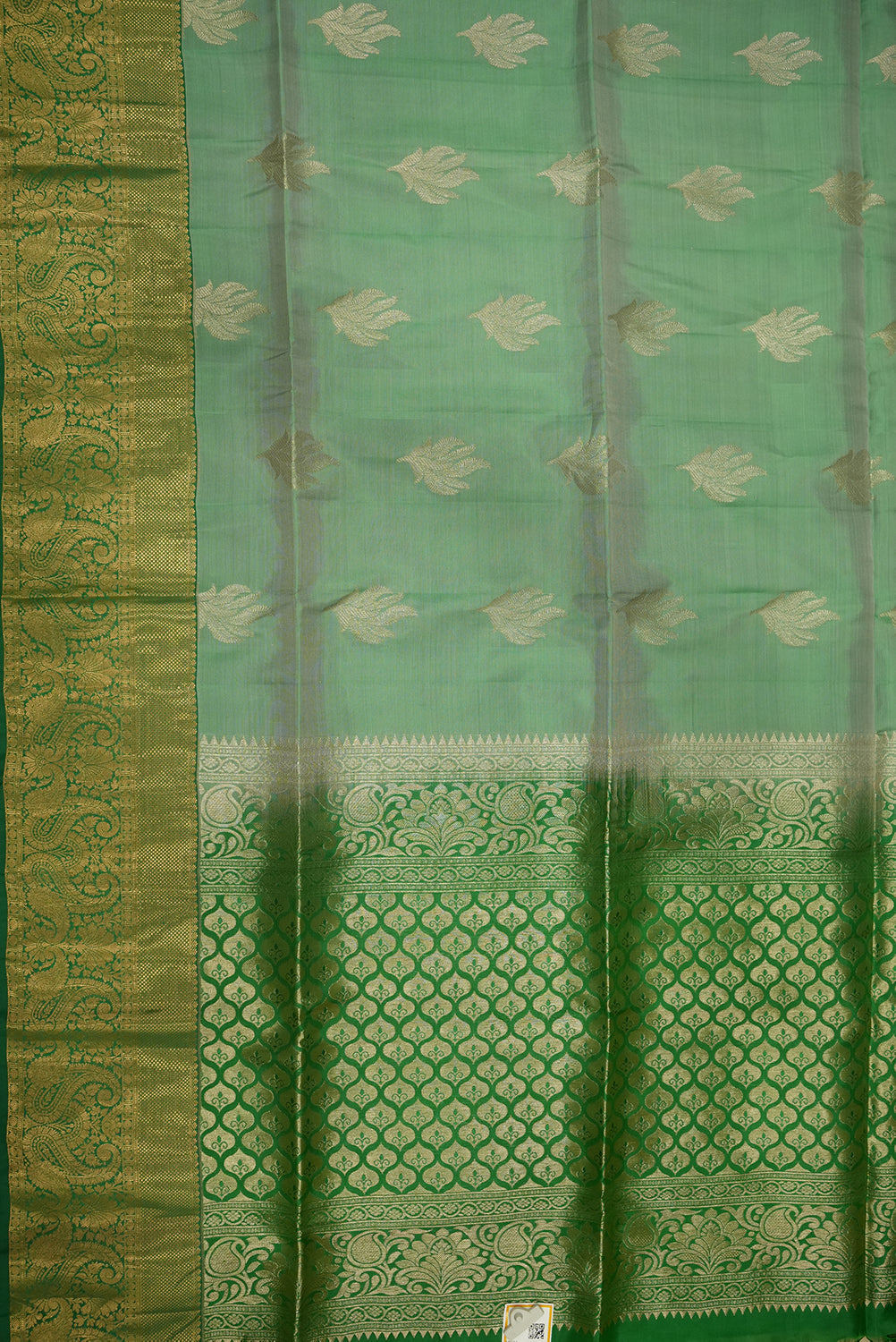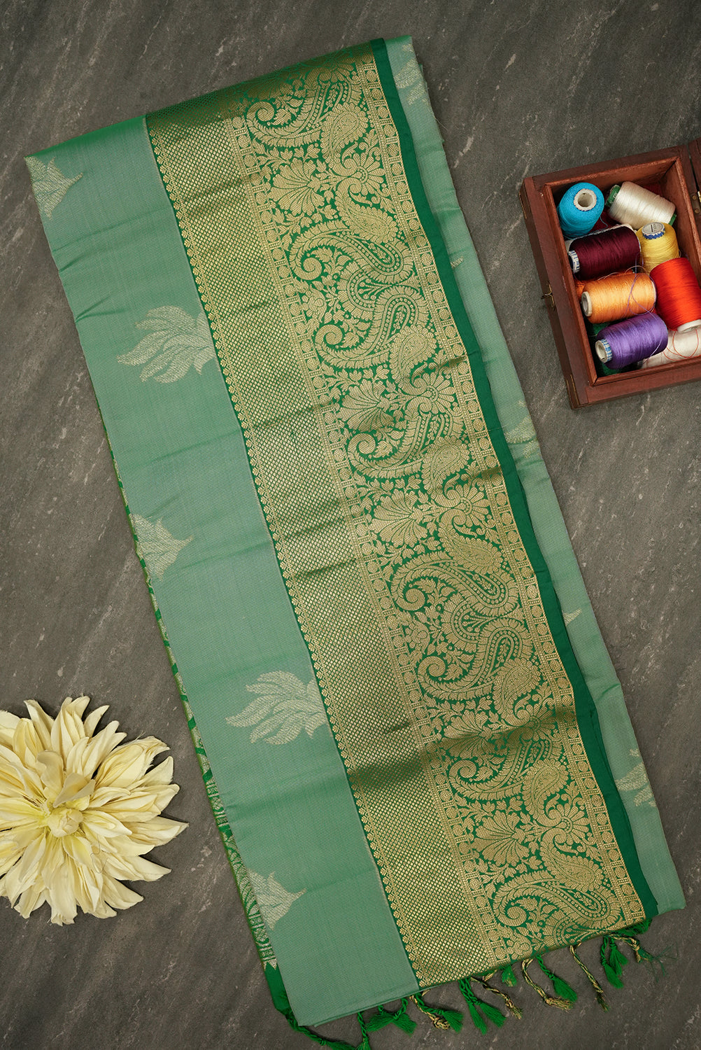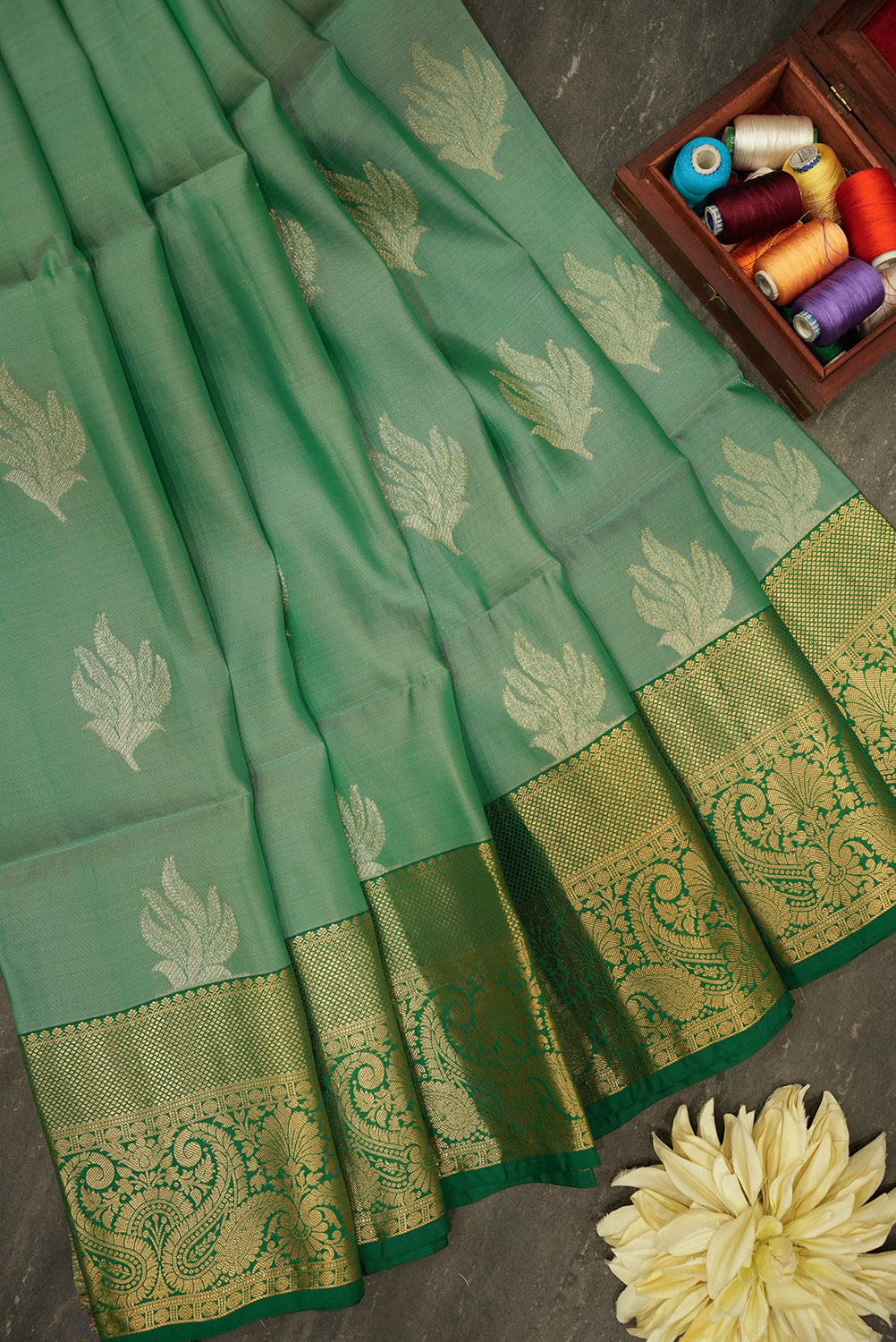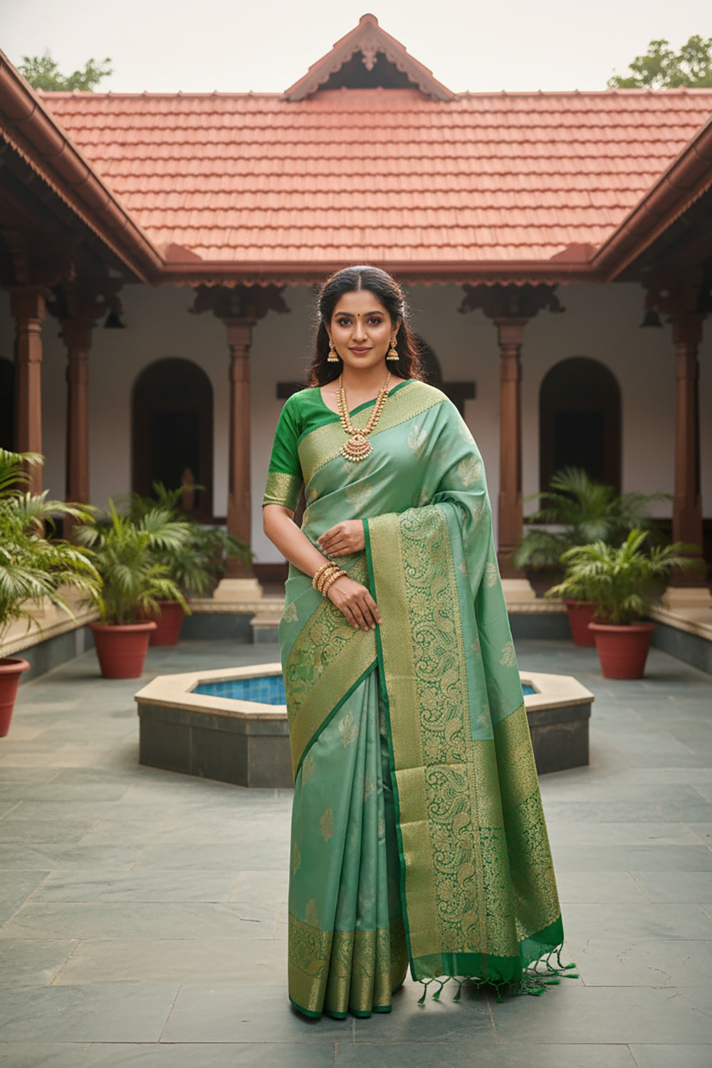 This elegant soft silk saree features a beautiful sage green body, adorned with a subtle leaf pattern woven in a lighter green. The saree is finished with a striking wide border and pallu, featuring a detailed golden zari paisley and floral design. This luxurious and lightweight saree is a perfect choice for weddings, festive occasions, and special events.
