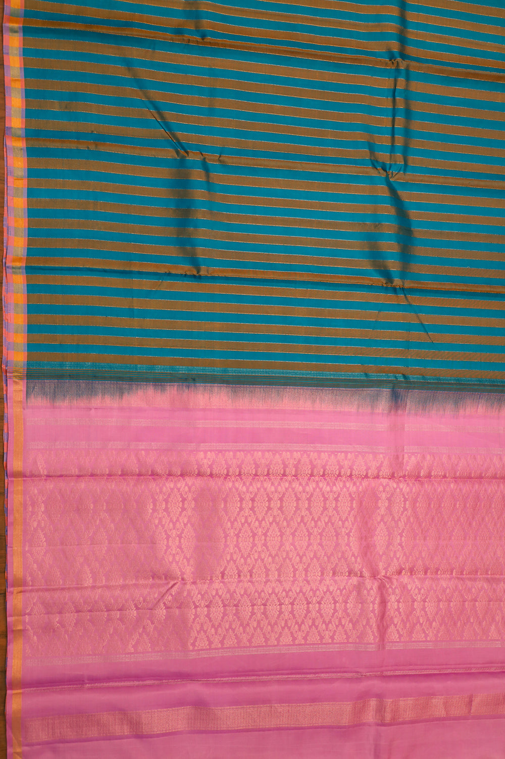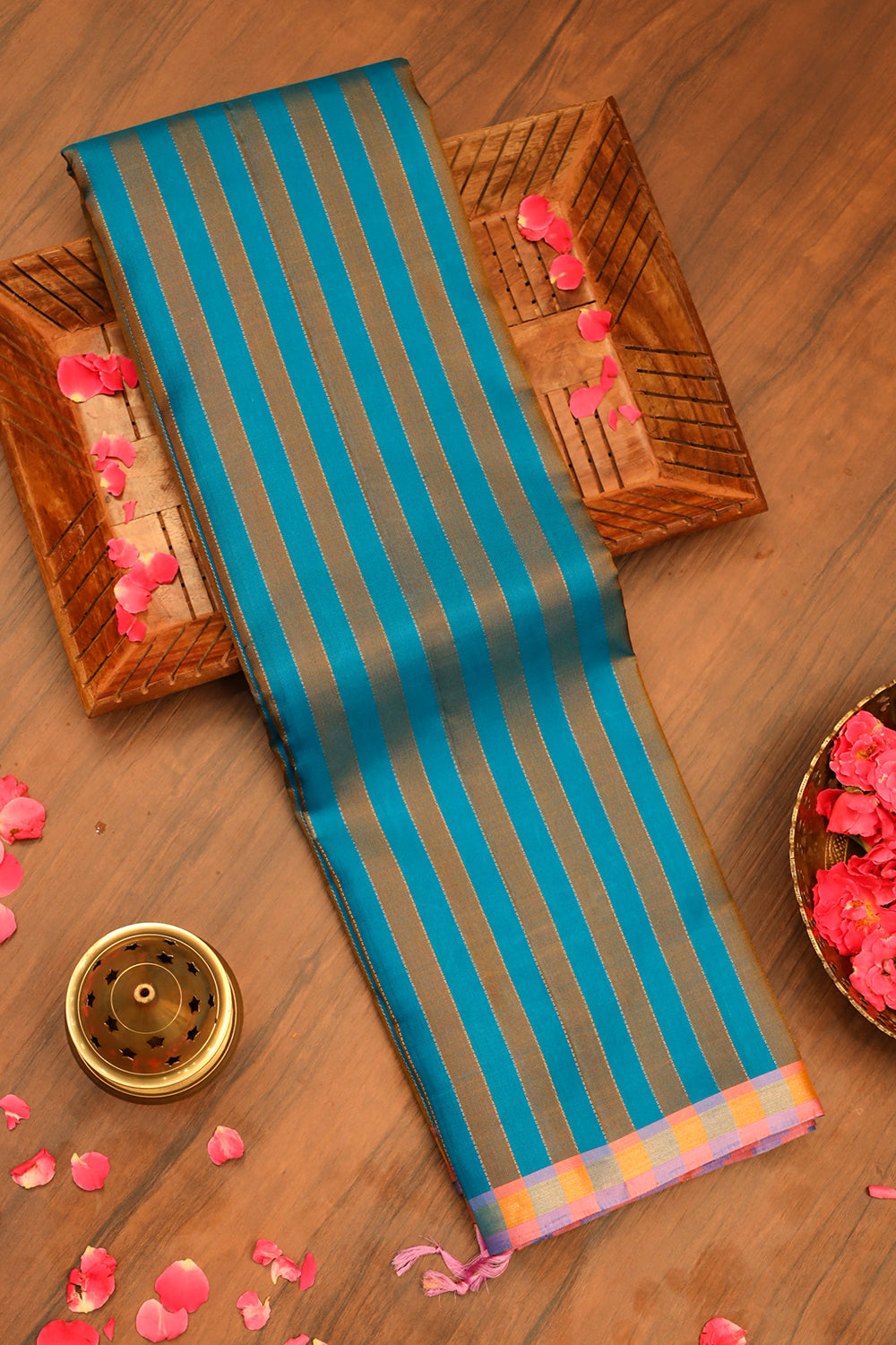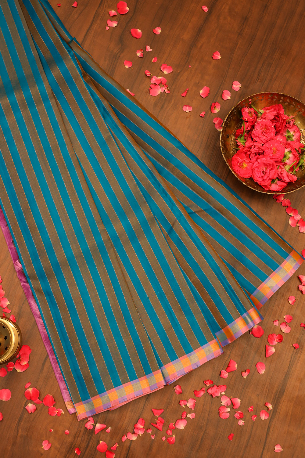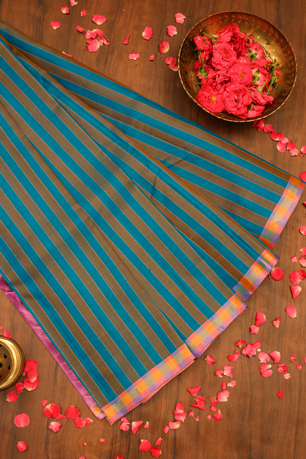 Teal and Bronze Striped Silk Saree with Contrast Border