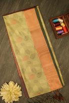 This saree is a beautiful blend of natural tones and intricate weaving. The body is a serene willow green, adorned with delicate motifs that resemble leaves in shades of peach and silver. The contrasting pallu in a subtle peach hue adds a touch of warmth. A narrow, dark maroon border provides an elegant finish, making this soft silk saree a sophisticated choice for any occasion. Unstitched blouse attached.