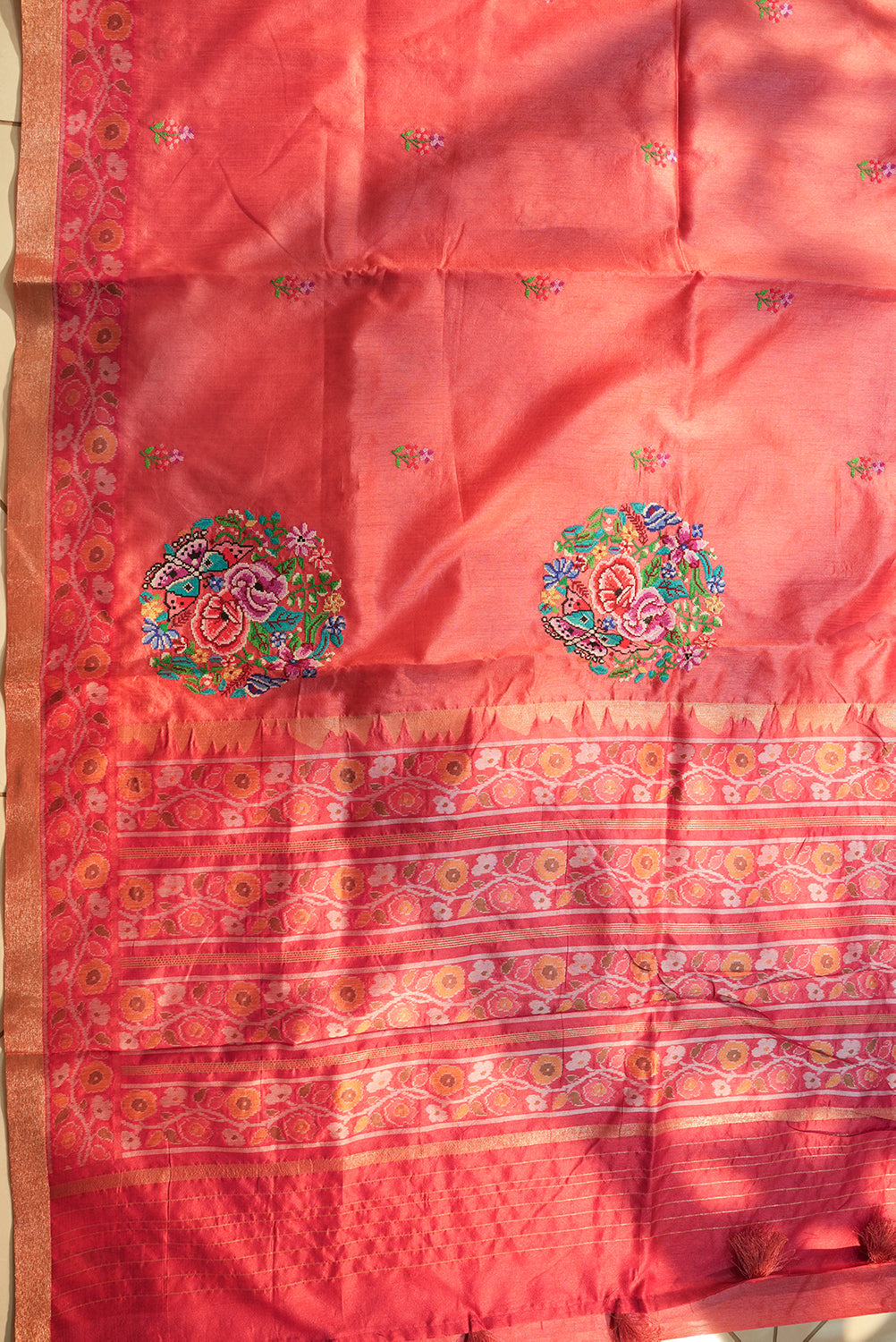 Celebrate artisanal craftsmanship with this exquisite Coral Tussar Silk saree. It features intricate, multi-colored hand-embroidered floral mandalas and delicate buttis in shades of turquoise, rose pink, and violet. The saree is finished with a traditional copper-gold zari border and playful tassels. Unstitched blouse attached.