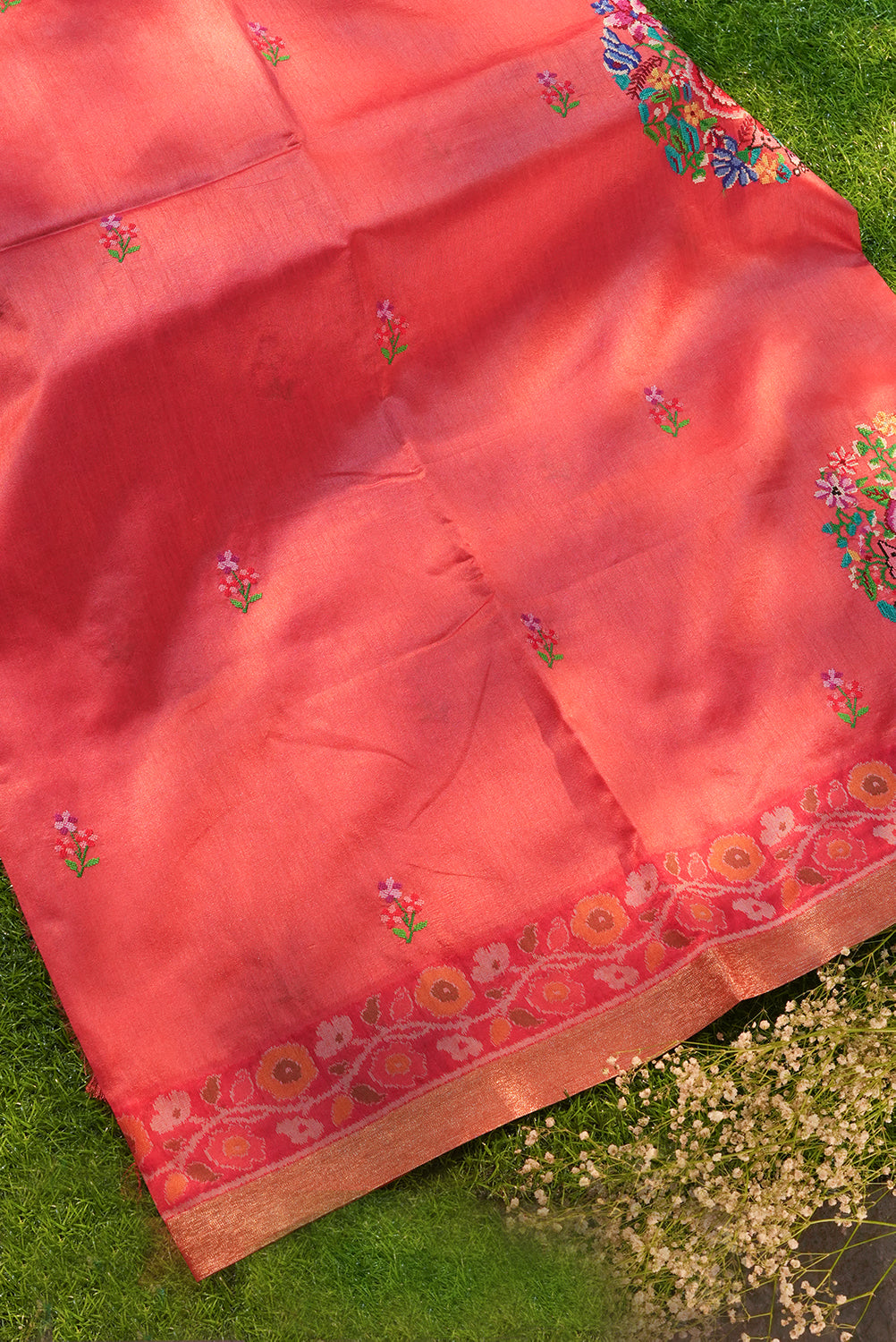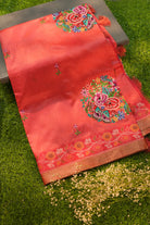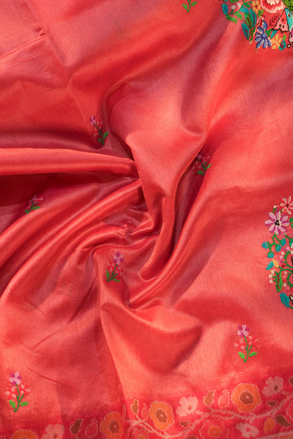 Coral Peach Embroidered Tussar Silk Saree with Floral Buttis