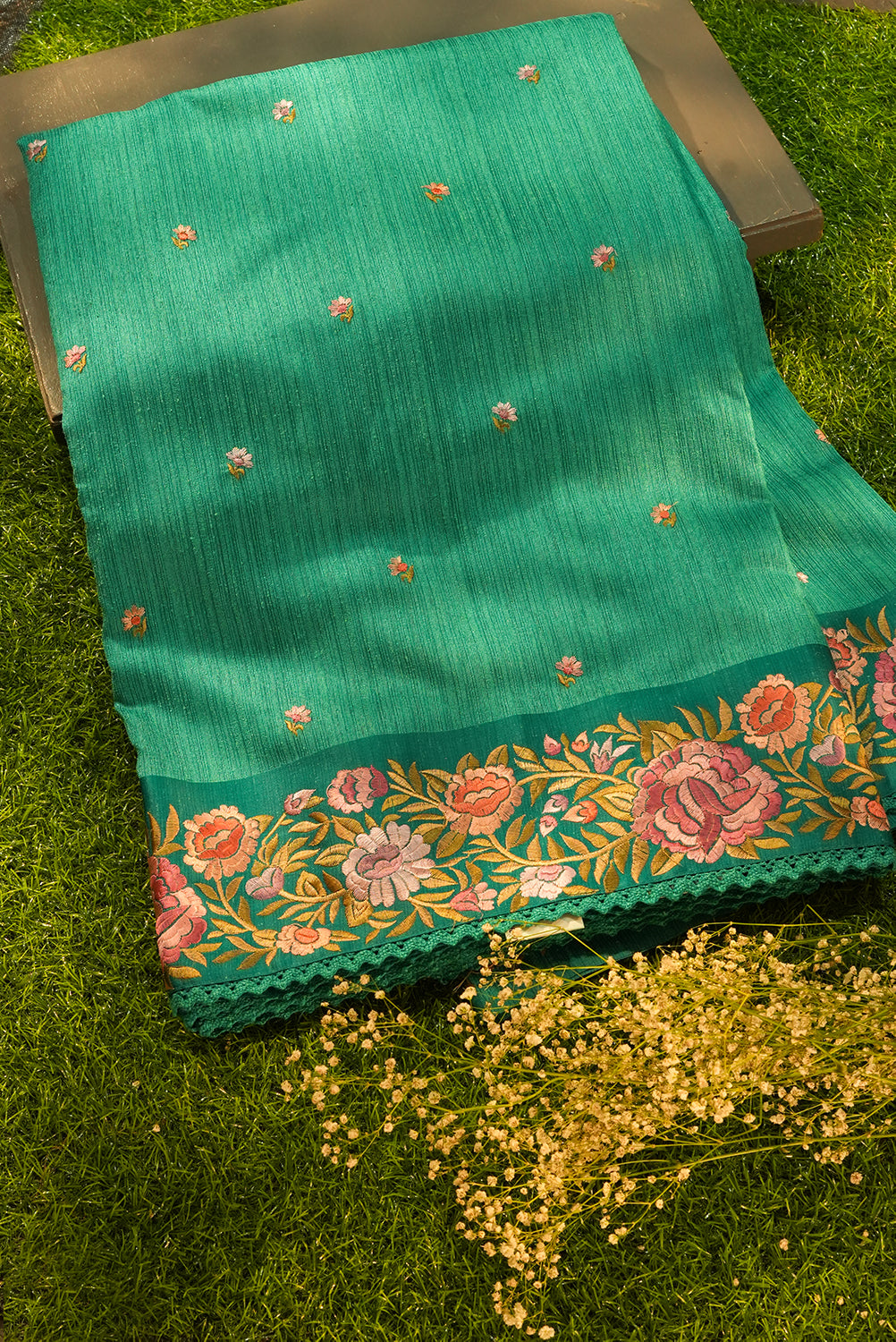 Embrace timeless grace in this stunning Teal Green Tussar silk saree. The body is sprinkled with dainty floral buttas, while the border features a vibrant hand-painted style floral embroidery. Complete with a delicate scalloped lace edge, it’s the perfect blend of tradition and modern flair for any special occasion. Unstitched blouse attached.