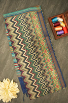 Stand out with this striking tussar silk saree showcasing a dynamic zig-zag design. The earthy tones of green, gold, and burgundy are complemented by a rich blue and gold border, perfect for a modern yet traditional look. Unstitched blouse attached.
