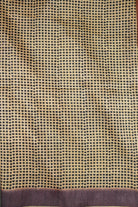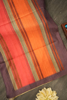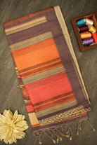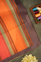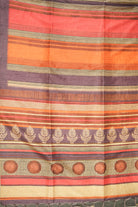 his elegant Tussar silk saree features a striking striped design in shades of orange, red, and brown. The deep purple border complements the vibrant body, while the unique polka dot pattern on the pallu adds a playful and stylish element. *Unstitched blouse attached.