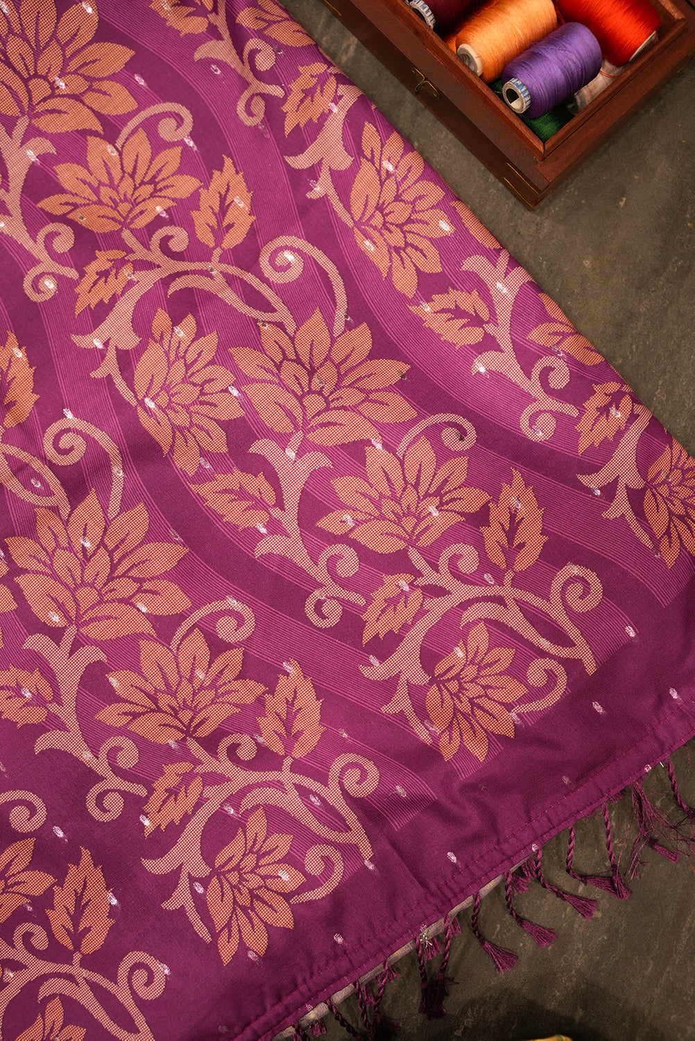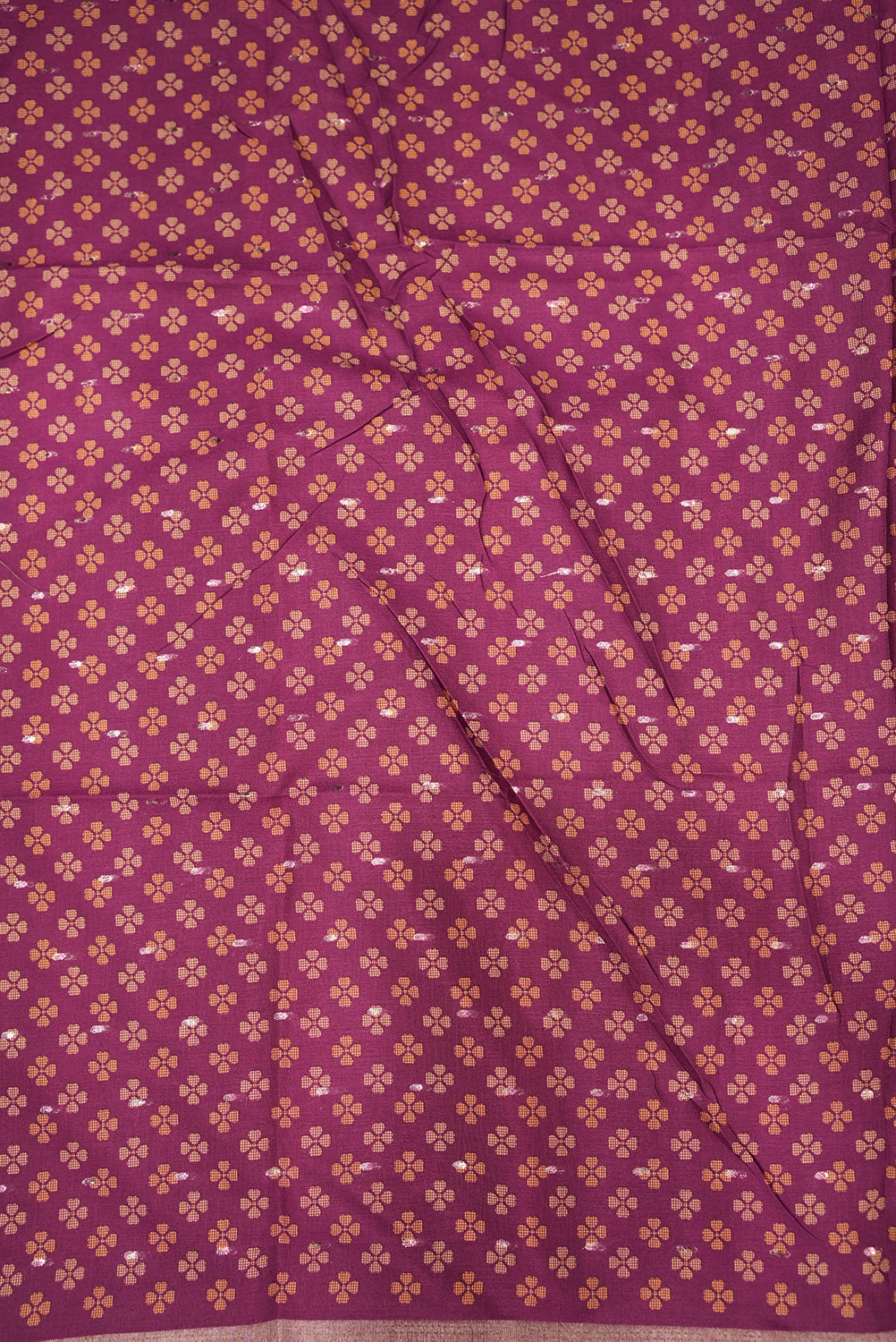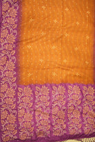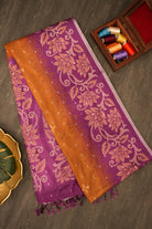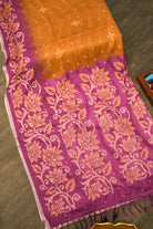 This striking handloom Tussar saree showcases a sunny orange field, lightly scattered with sparkling buttis (motifs). The drama lies in the broad, eye-catching border and pallu area in deep magenta, featuring exquisite, detailed gold-toned floral vine weaving.