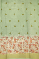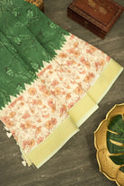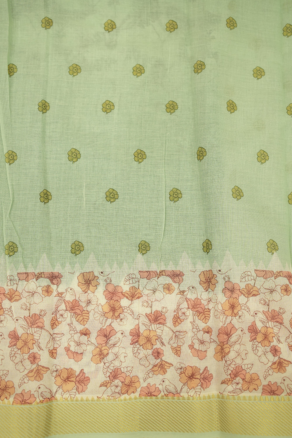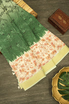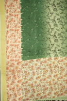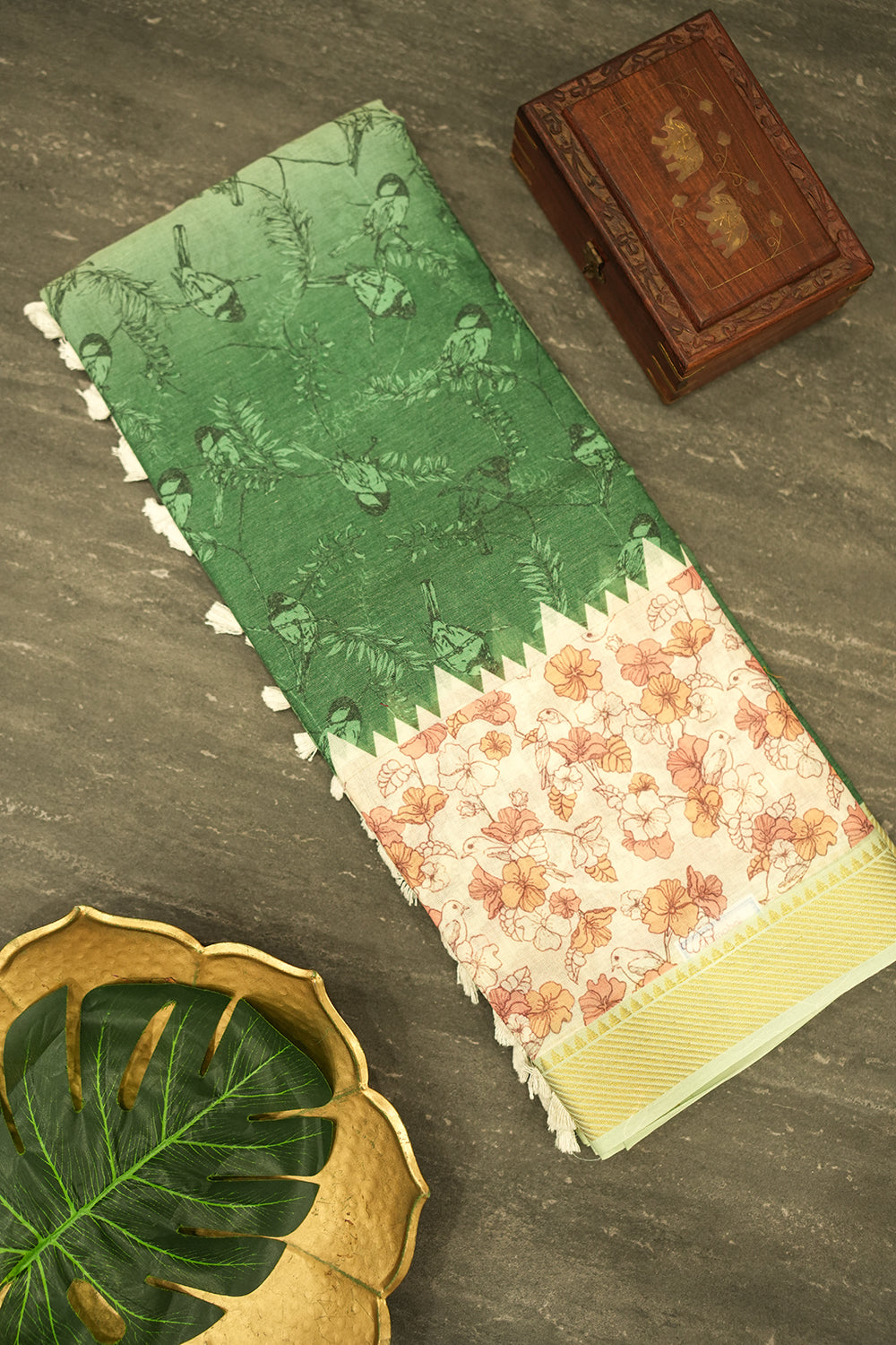 A stylish cotton saree showcasing a rich green hue with unique bird patterns, transitioning to a light cream bottom border with charming peach and light orange floral designs. Unstitched blouse attached.