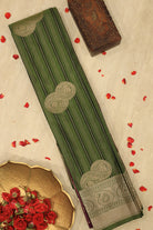 This stunning saree comes in a sophisticated olive green hue with delicate stripes. It is adorned with beautifully woven, large circular motifs in antique gold zari. The traditional paisley border adds a touch of timeless grandeur to the drape. Unstitched blouse attached.