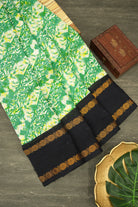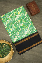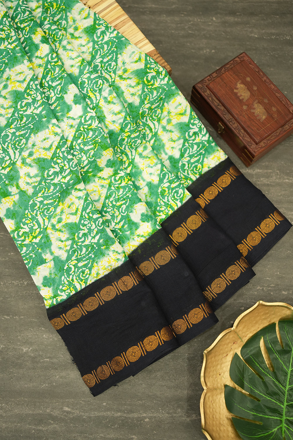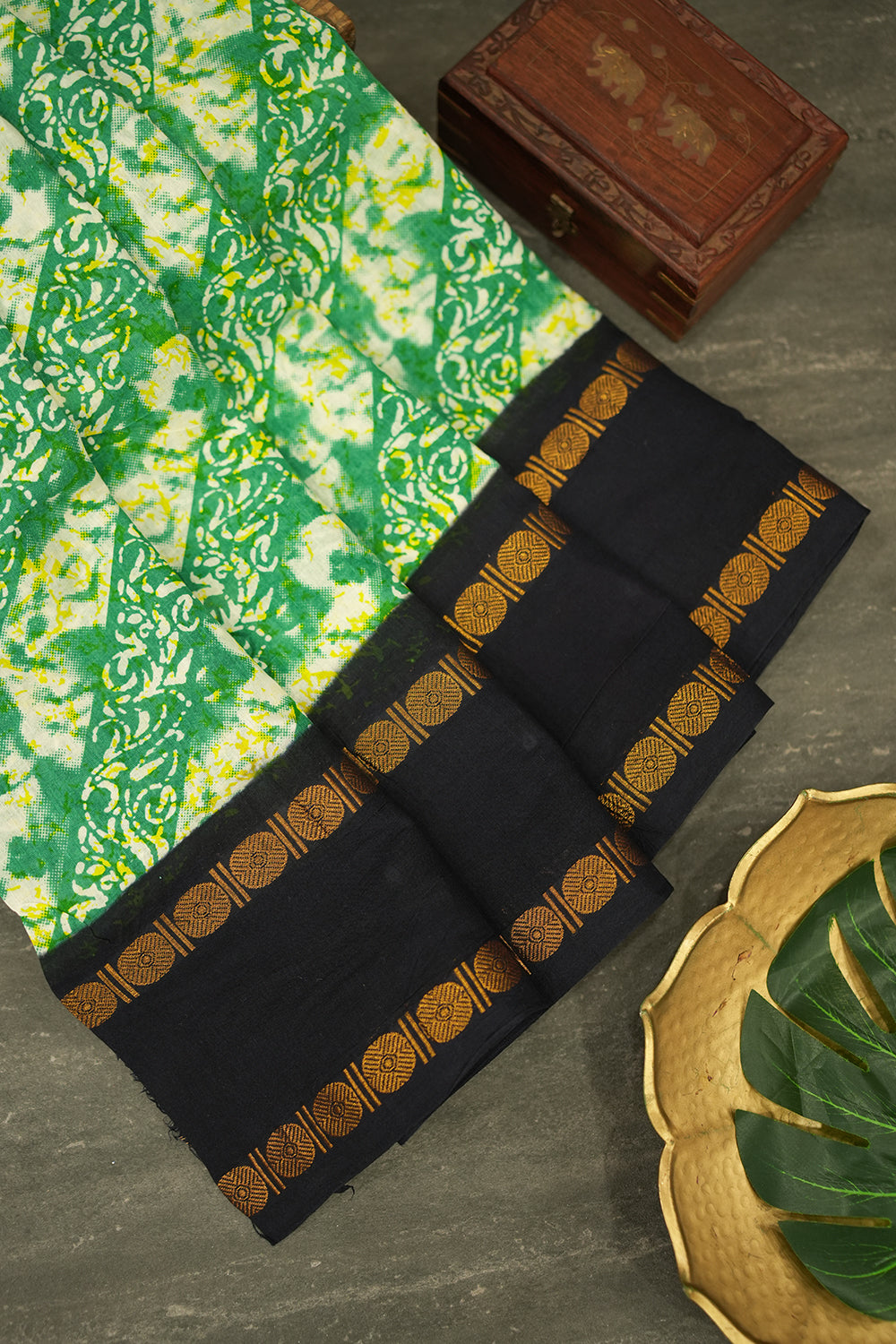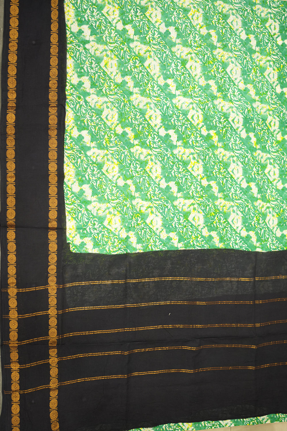 A striking cotton saree presenting a contemporary green and off-white abstract design. The deep black border and pallu are highlighted with narrow golden zari-like stripes, enhancing its elegance. Blouse not attached.