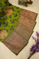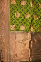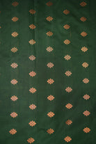 Lush Green Silk Saree featuring elegant woven motifs and a richly detailed brocade border that adds depth and grandeur. A fine showcase of Indian craftsmanship. Includes unstitched blouse for a perfect custom fit.