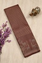 Elevate your ethnic wardrobe with this stunning Chocolate Brown Pure Silk Saree. The rich, warm shade of brown is enhanced by exquisite zariwork woven throughout the body and along the elaborate border. The intricate patterns, including graceful deer and natural elements, add a regal touch to this luxurious silk drape. Unstitched blouse attached.
