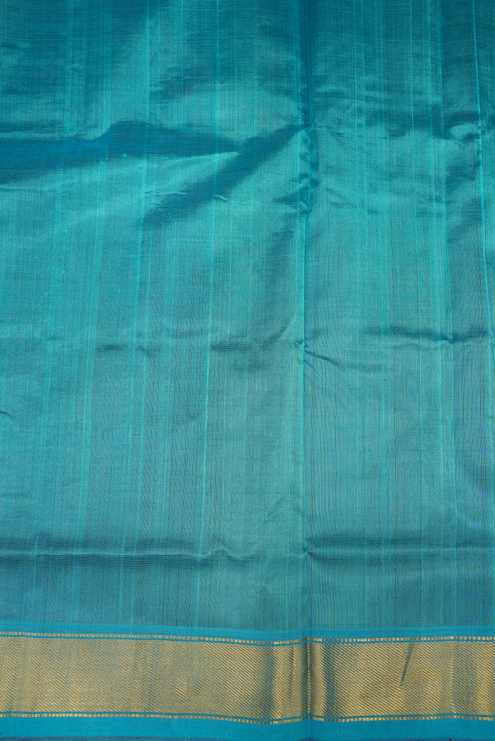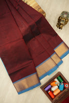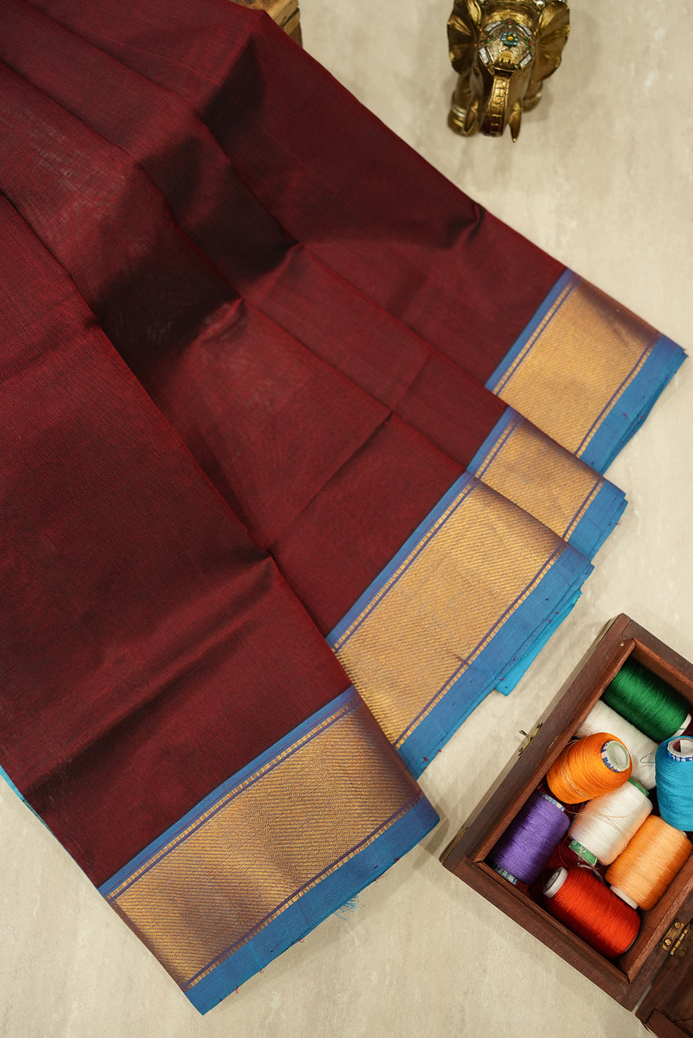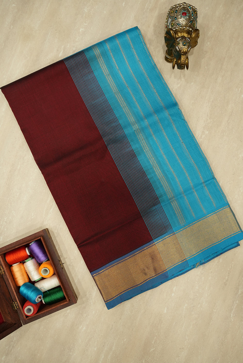 A classic and elegant silk cotton saree in a rich maroon shade. The saree features a striking sky blue border with intricate golden zari work, offering a beautiful contrast. Unstitched blouse attached.