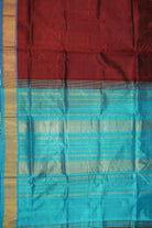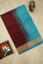 Maroon Silk Cotton Saree with Sky Blue and Gold Border