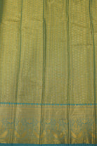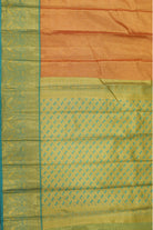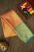 An enchanting silk saree featuring a shimmering peach body with a self-color weave. The saree is contrasted with a vibrant teal blue border, intricately woven with rich gold zari motifs and a simple zigzag pattern, giving it a modern yet traditional appeal. This saree is perfect for festive gatherings and celebrations. Unstitched blouse attached.