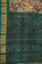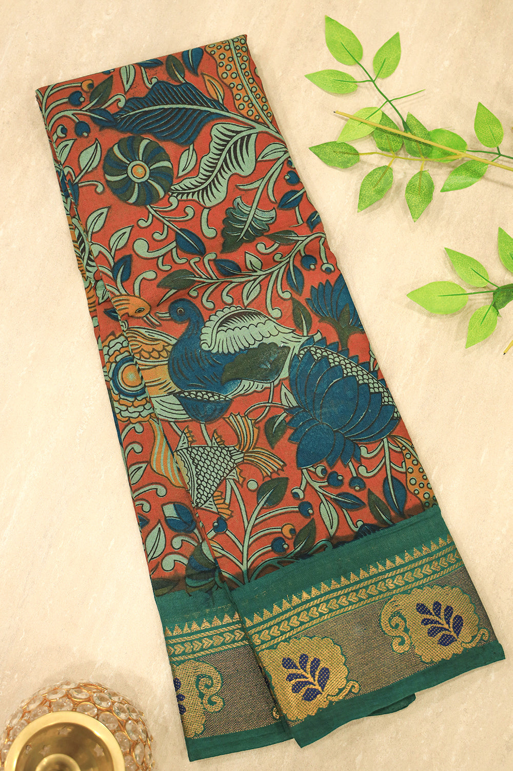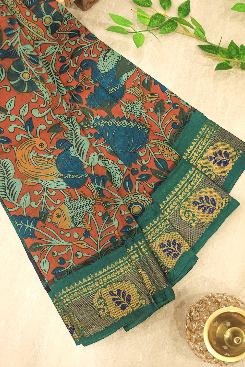 Showcasing a stunning peacock and floral print, this cotton saree is a work of art. Its warm, rustic orange canvas is detailed with beautiful teal and blue designs. The look is completed with a contrasting rich green and gold woven border. Blouse not attached.