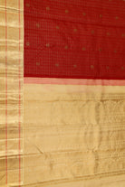 A timeless pure silk saree featuring a captivating red body. Beautifully woven with golden threads forming delicate checks and patterns. Complemented by a luxurious golden contrast border. Unstitched blouse attached.