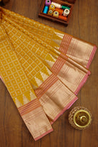 A rich silk saree in a striking orange-yellow shade. Features an elegant contrasting pink border. Perfect for adding a pop of color to your wardrobe. Unstitched blouse attached.