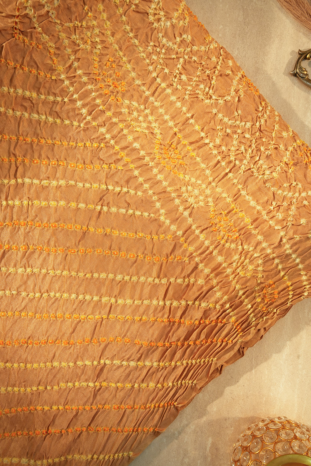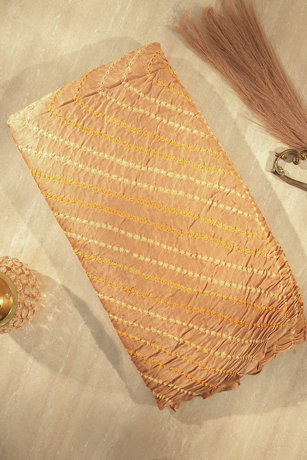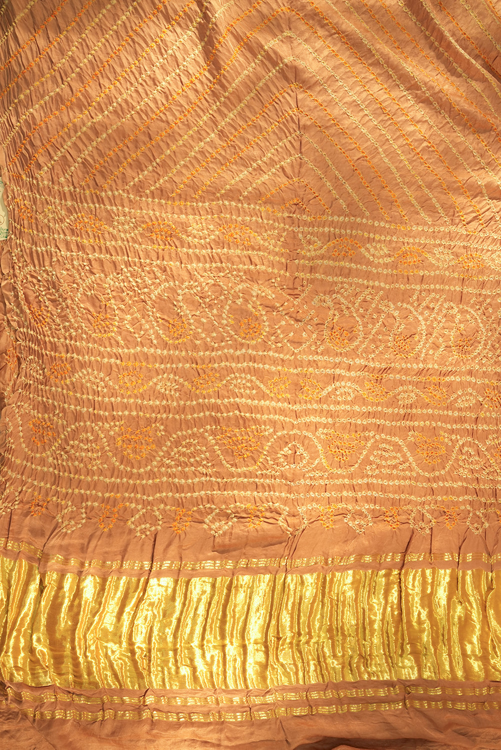 Beige Bandhani Saree with Yellow Diagonal Stripes