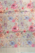 A classic black raw silk saree featuring a romantic floral print in shades of rose, peach, and violet. This lightweight yet structured drape is finished with a coordinated striped Zari border, ideal for festive gatherings and elegant dinner parties. Unstitched blouse attached.