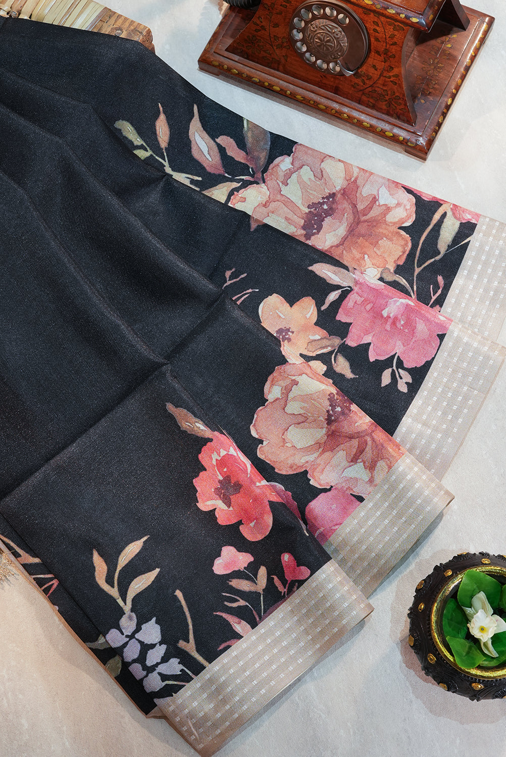 Black Raw Silk Floral Saree