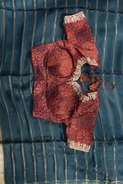 Drape yourself in sophistication with this pure satin designer saree in a deep, rich teal. The fabric is beautifully accented with subtle, shimmering horizontal stripes and a gold zari border. It is perfectly paired with a contrasting, heavy maroon brocade blouse featuring intricate gold embroidery on the sleeves and neckline