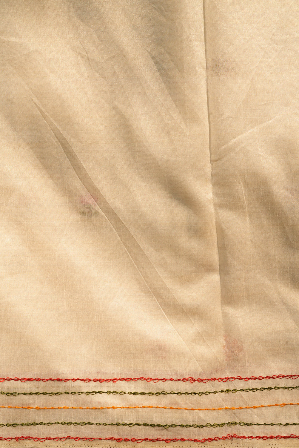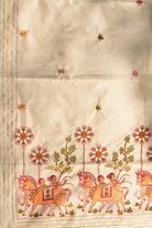 : A sophisticated take on ethnic wear, this ivory cotton saree features delicate multi-color kantha-style stitching along the edges. The highlight is the whimsical equestrian embroidery at the hem, featuring shades of blush pink and earthy ochre. Lightweight and breathable, it offers a graceful drape for day-long events. Unstitched blouse attached.